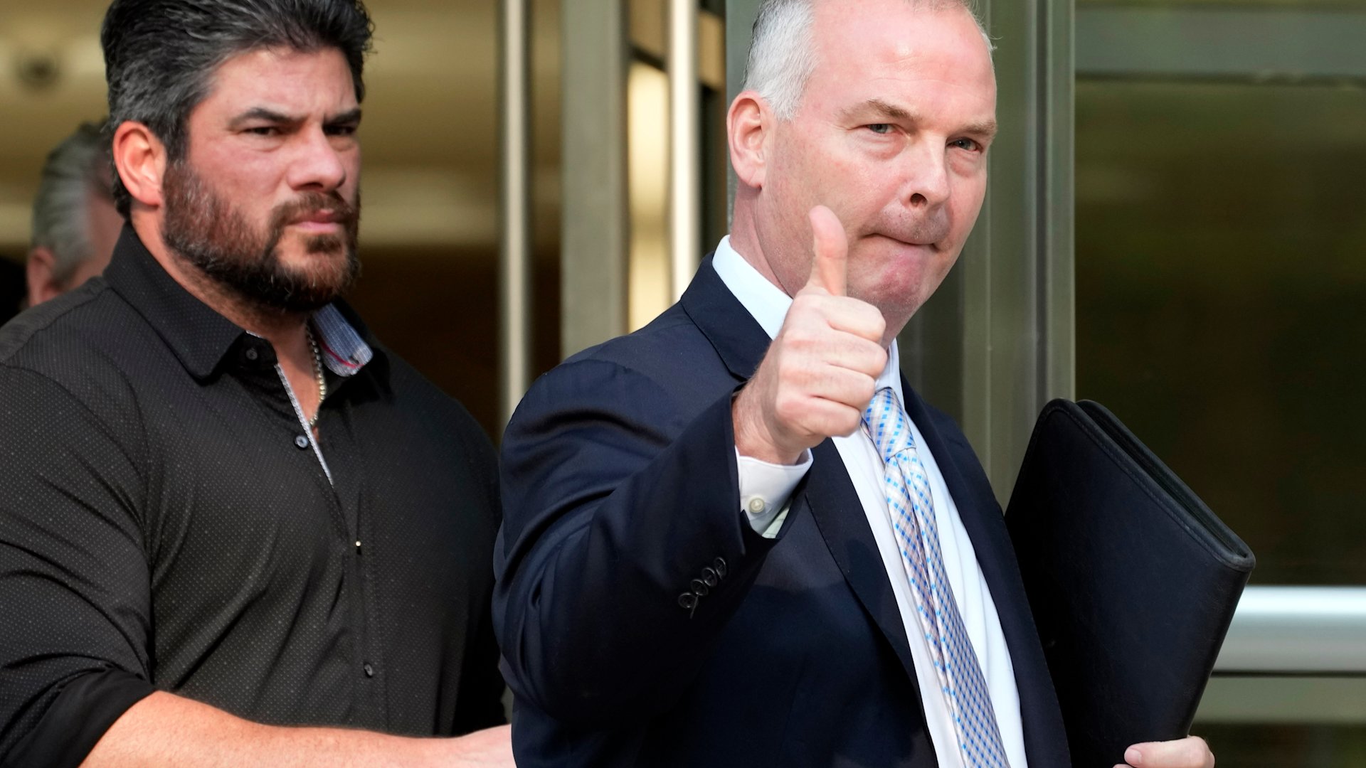FILE - Michael McMahon, right, gives photographers a thumbs up as he leaves federal court, May 31, 2023, in the Brooklyn borough of New York. McMahon was one of three men accused of participating in an escalating series of scare tactics aimed at repatriating a former Chinese official who was living quietly in New Jersey. McMahon was convicted of all except conspiracy to act as a foreign agent. (AP Photo/Mary Altaffer, File)