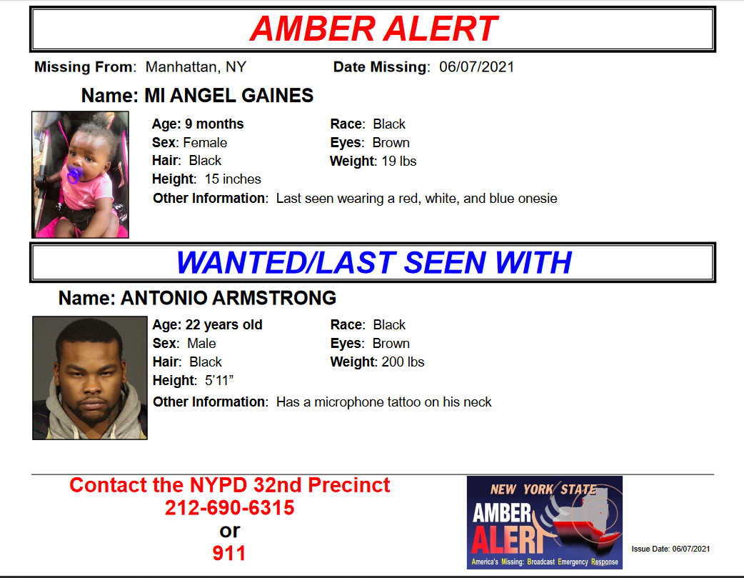 An Amber Alert has been issued for a 9-month-old who is believed to have been abducted in Manhattan.