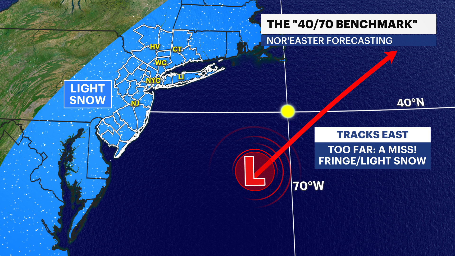 When storms pass directly over this point and other items, like temperature, are in place, we get a big snowstorm. If a storm passes closer to the coast, or inside that benchmark, we see more chances of rain. If a storm passes east of this point, we get a glancing blow with light snow or flurries.