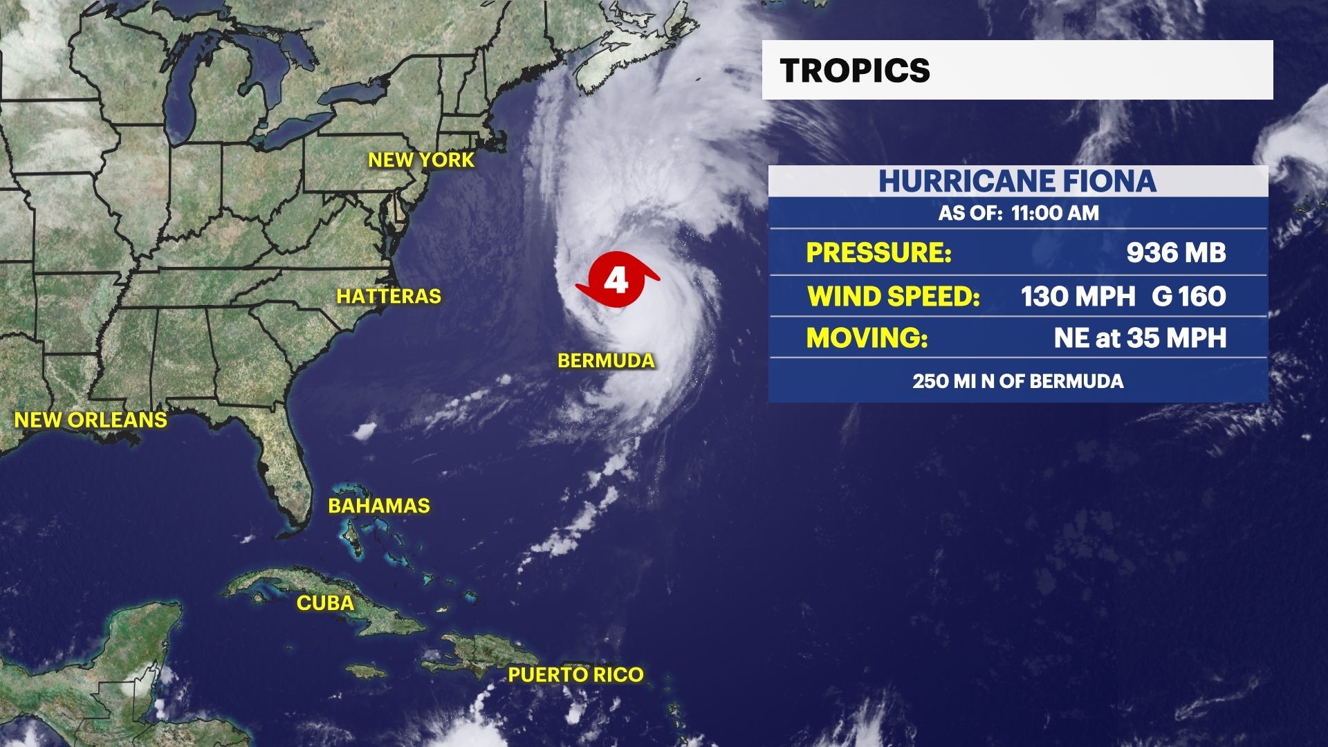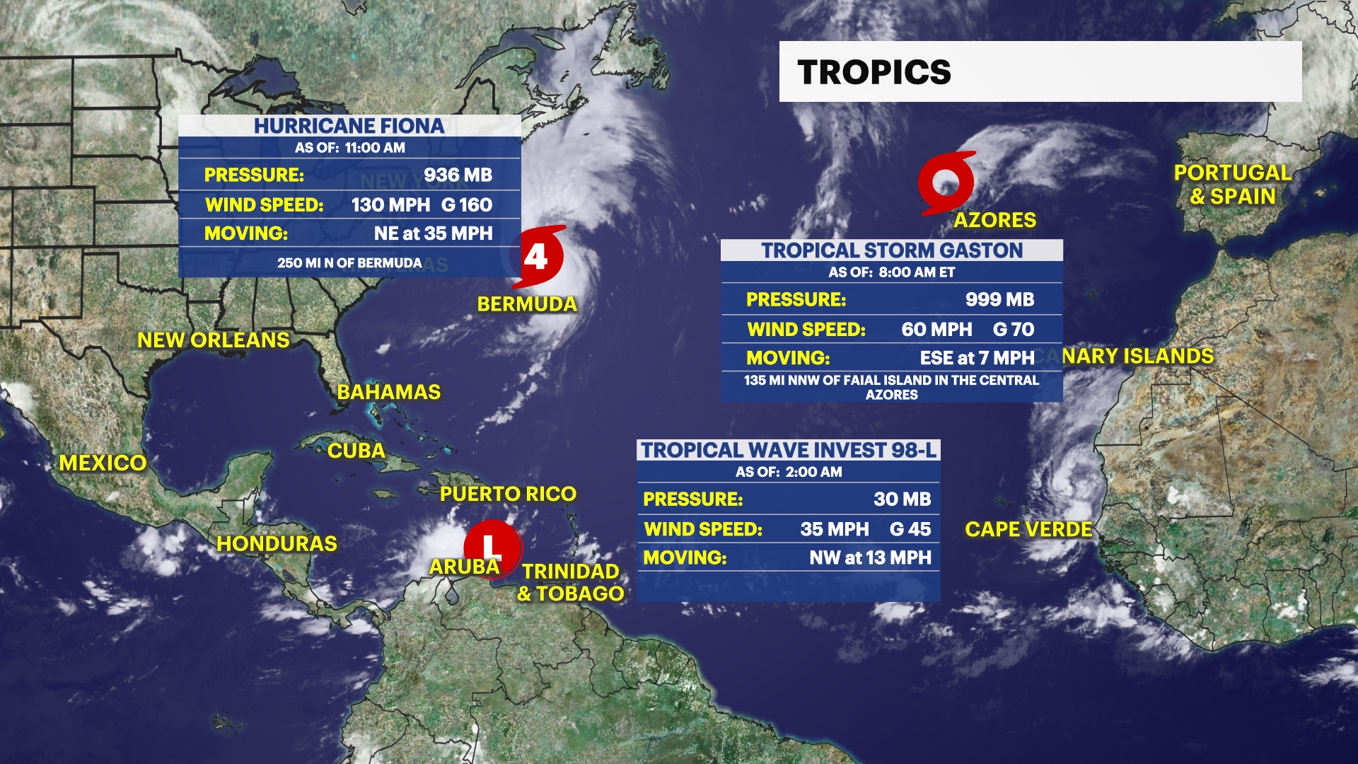 NEW - TROPICS: Tracking FOUR storms in the Atlantic, with Hurricane Fiona departing Bermuda and arriving in Atlantic Canada this weekend as one of their strongest cyclones on record. Florida is on high alert for a potential major hurricane midweek next week.