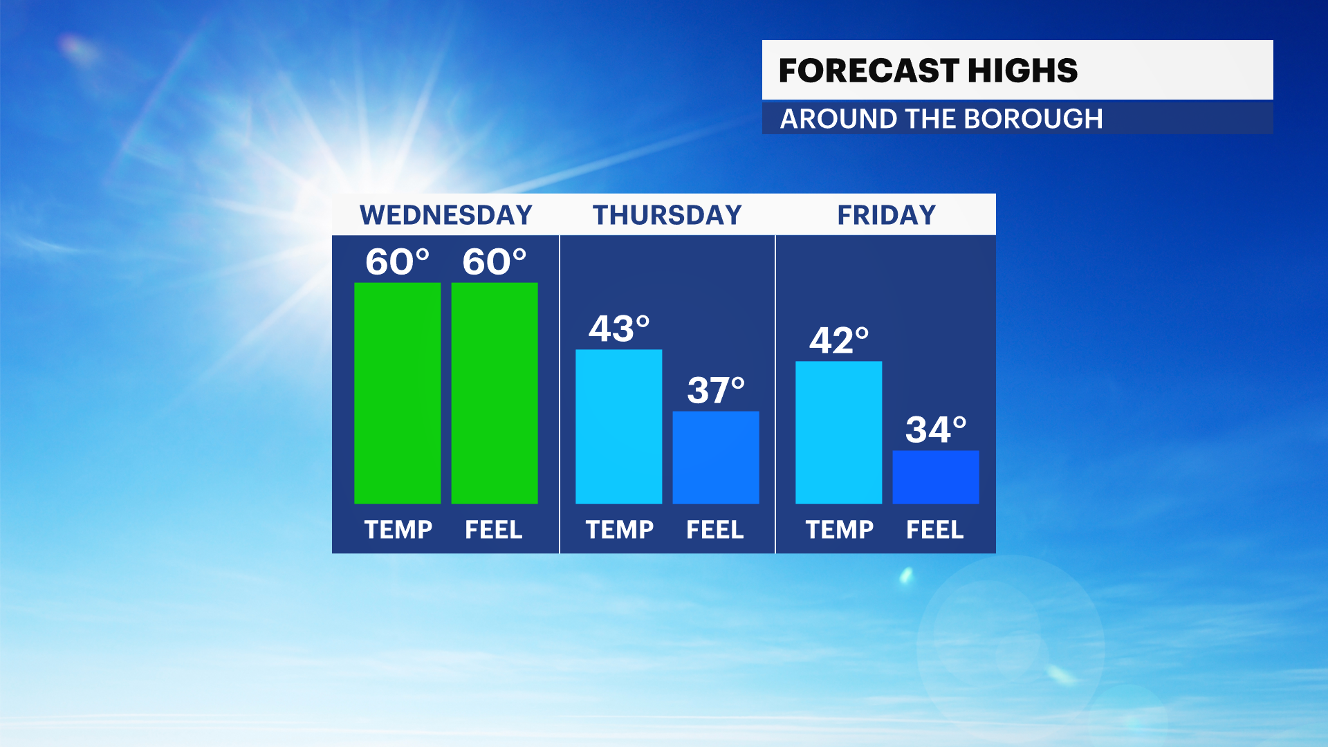 SATURDAY: Sunshine and breezy. Highs in the low 40s, lows in the low 30s.