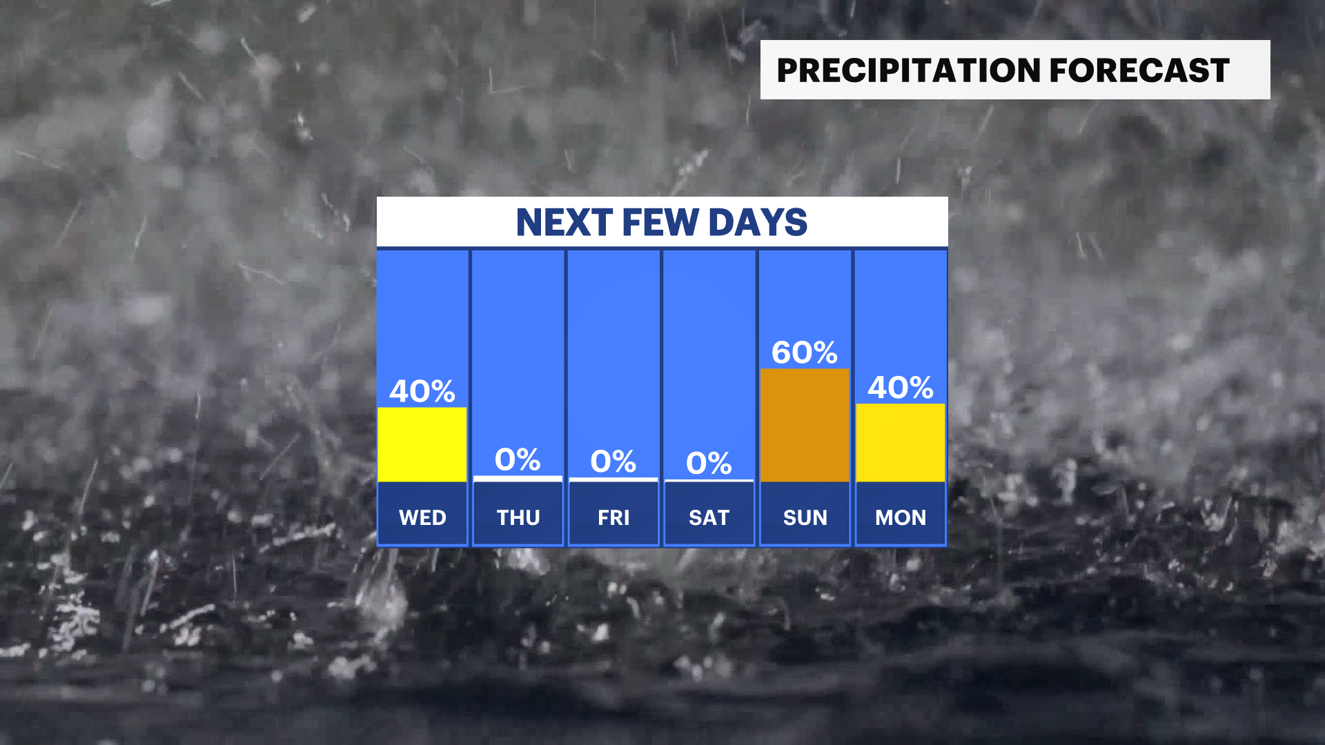 SUNDAY: Rain chances return. Highs in the high 40s, lows in the low 40s.