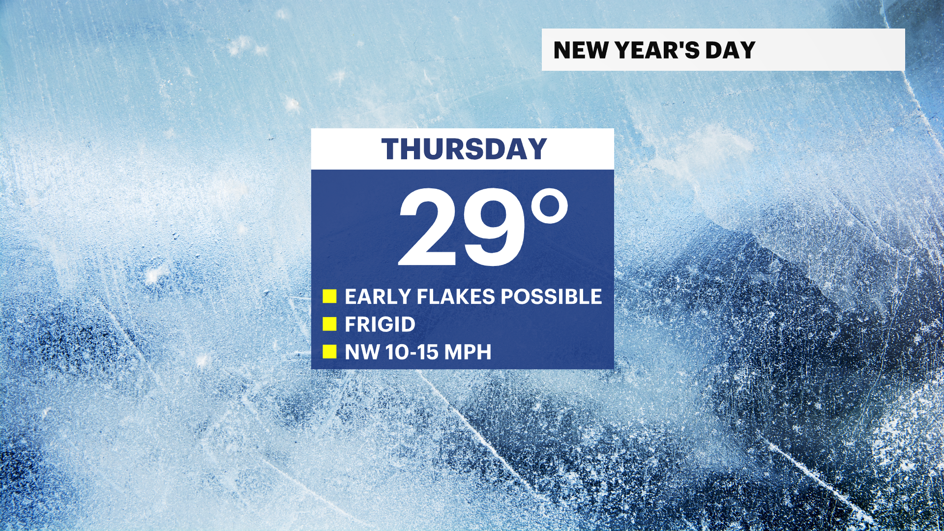 • A weak storm system will bring few flurries Wednesday morning. These flurries will not amount to anything across the city. Winds aren't as harsh on Wednesday, but another chance of flurries is possible after 11 p.m. into early New Year's Day. Stay tuned for updates.