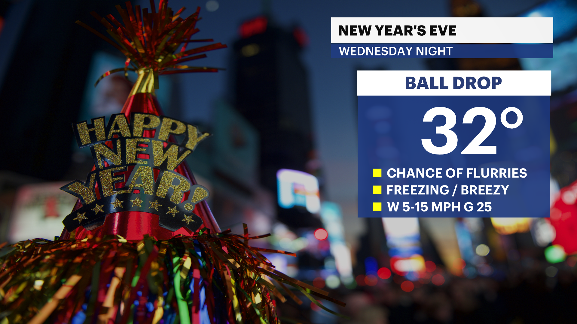 New Year's Eve: Morning flurries. Cold and partly sunny. Breezy at times. Chance of flurries at night. Highs near 34. Lows near 26.