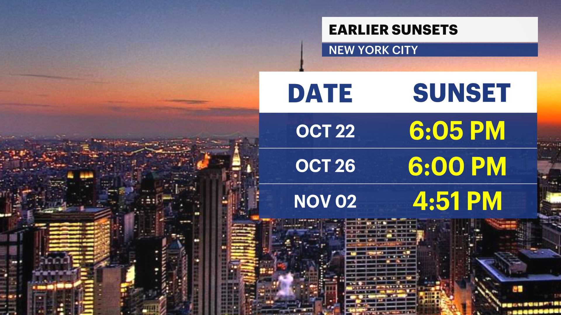 The following Sunday, we fall back to sunsets during the 4 p.m. hour. Prepare yourselves: dark winter months are coming fast.