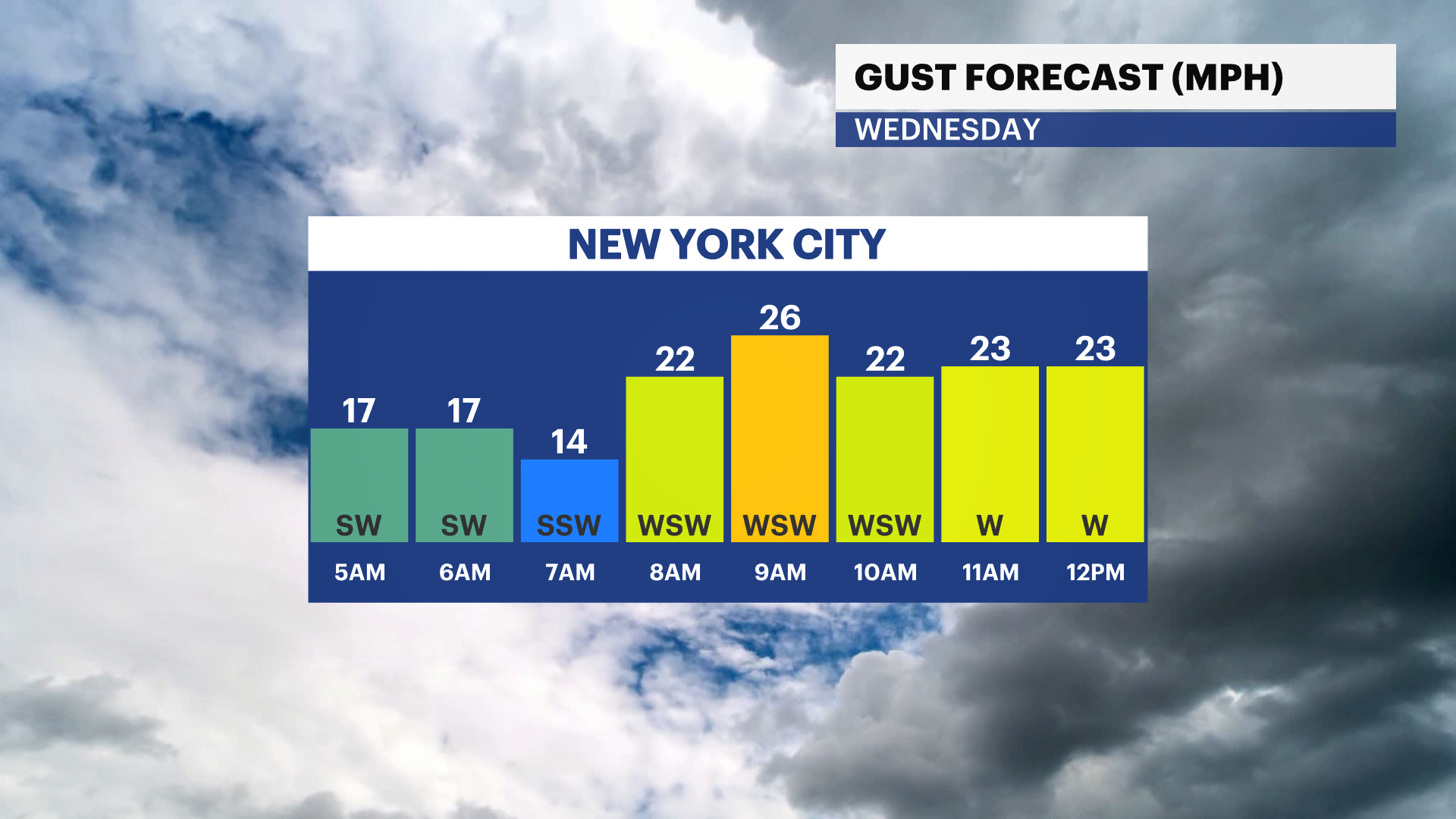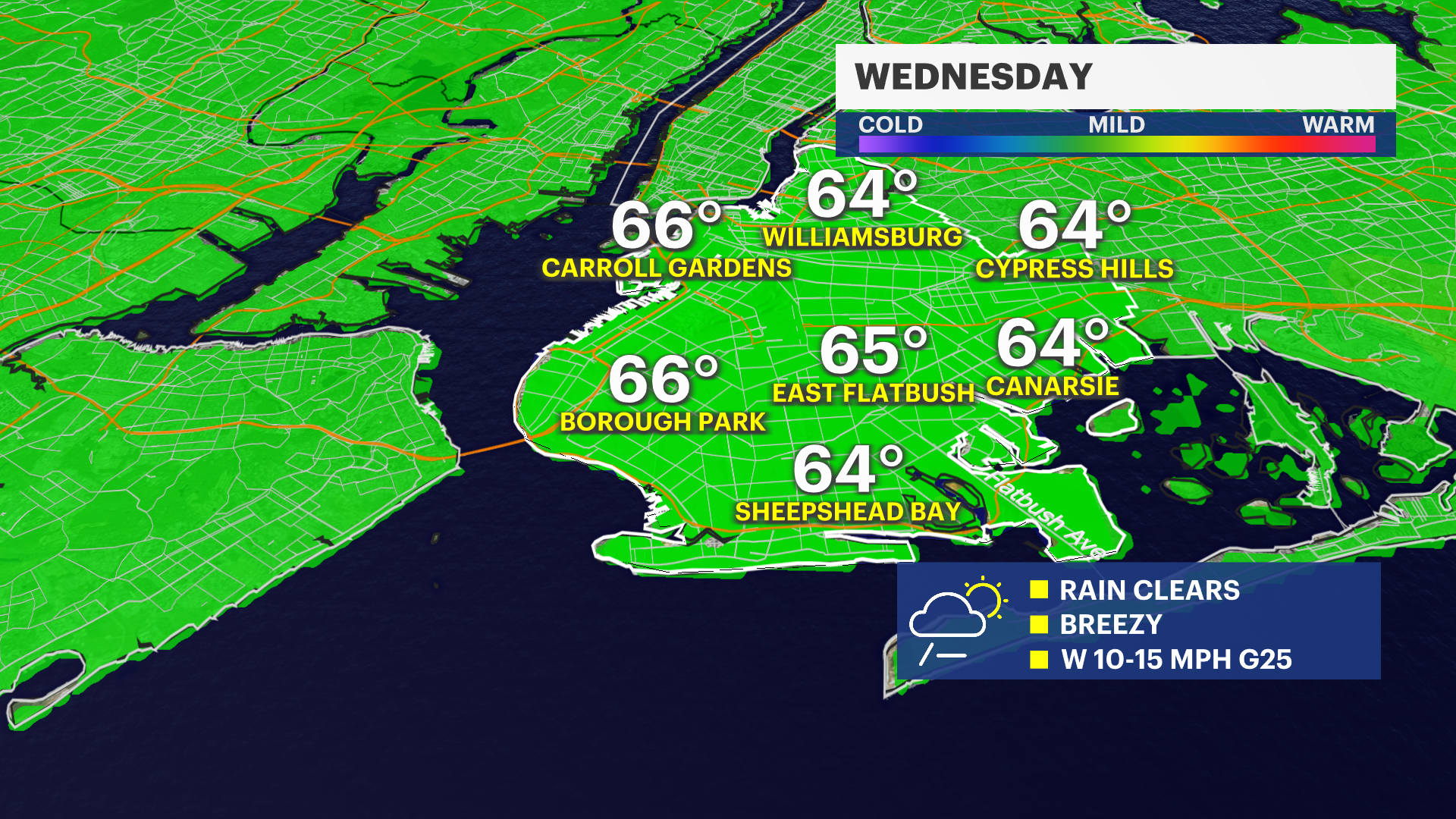 WEDNESDAY: Early morning rain with conditions improving in the weekend. Breezy. Highs in the low 60s, lows in the higher 40s.