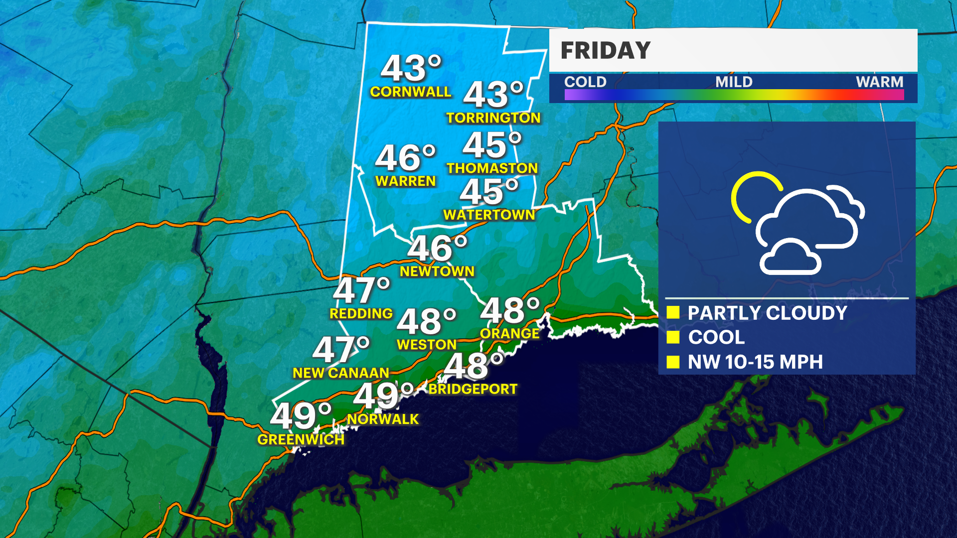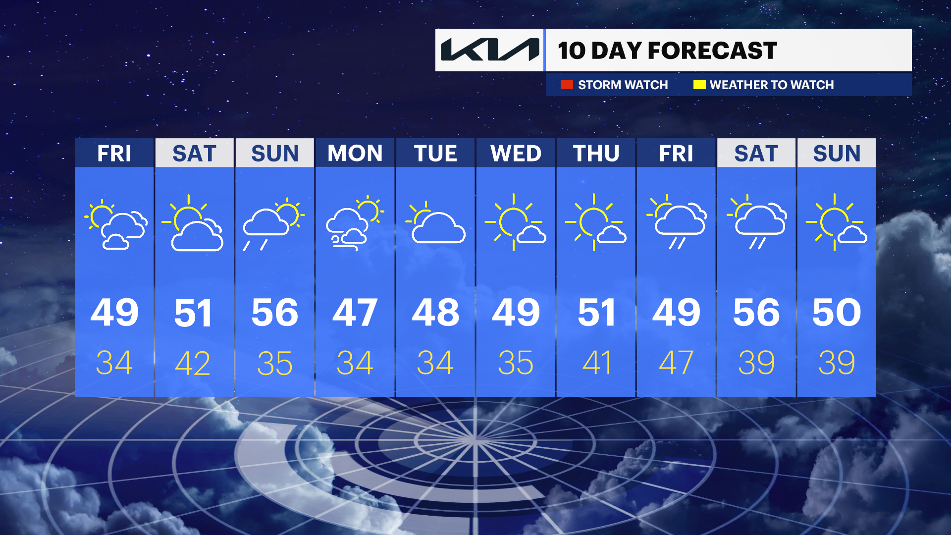 FRIDAY: Sun and clouds with breezy winds. High of 49.