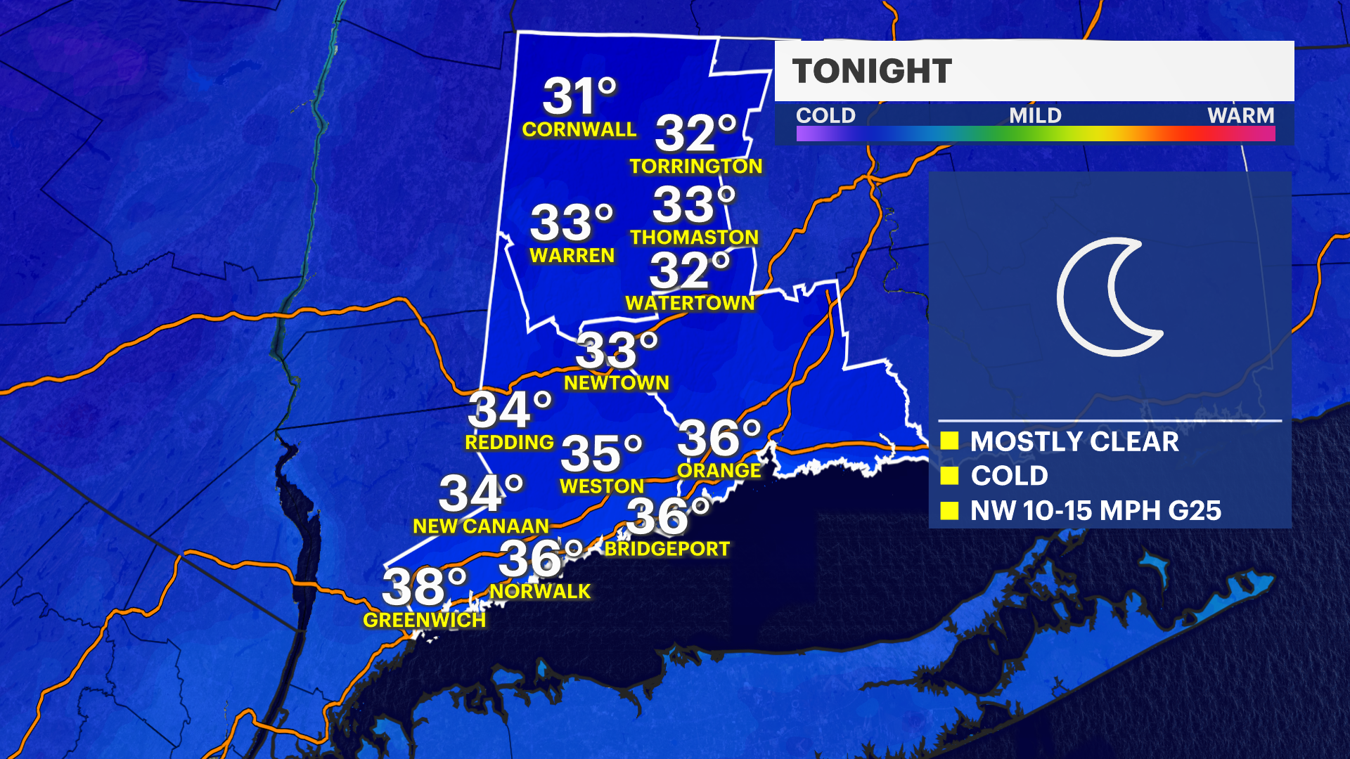 TONIGHT: Partly cloudy to mostly clear. Colder. Low of 36.