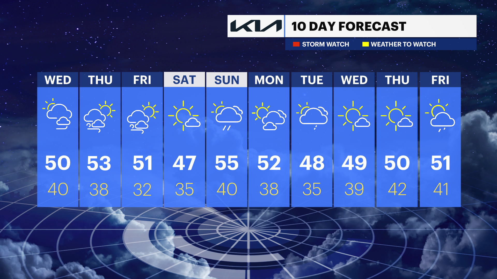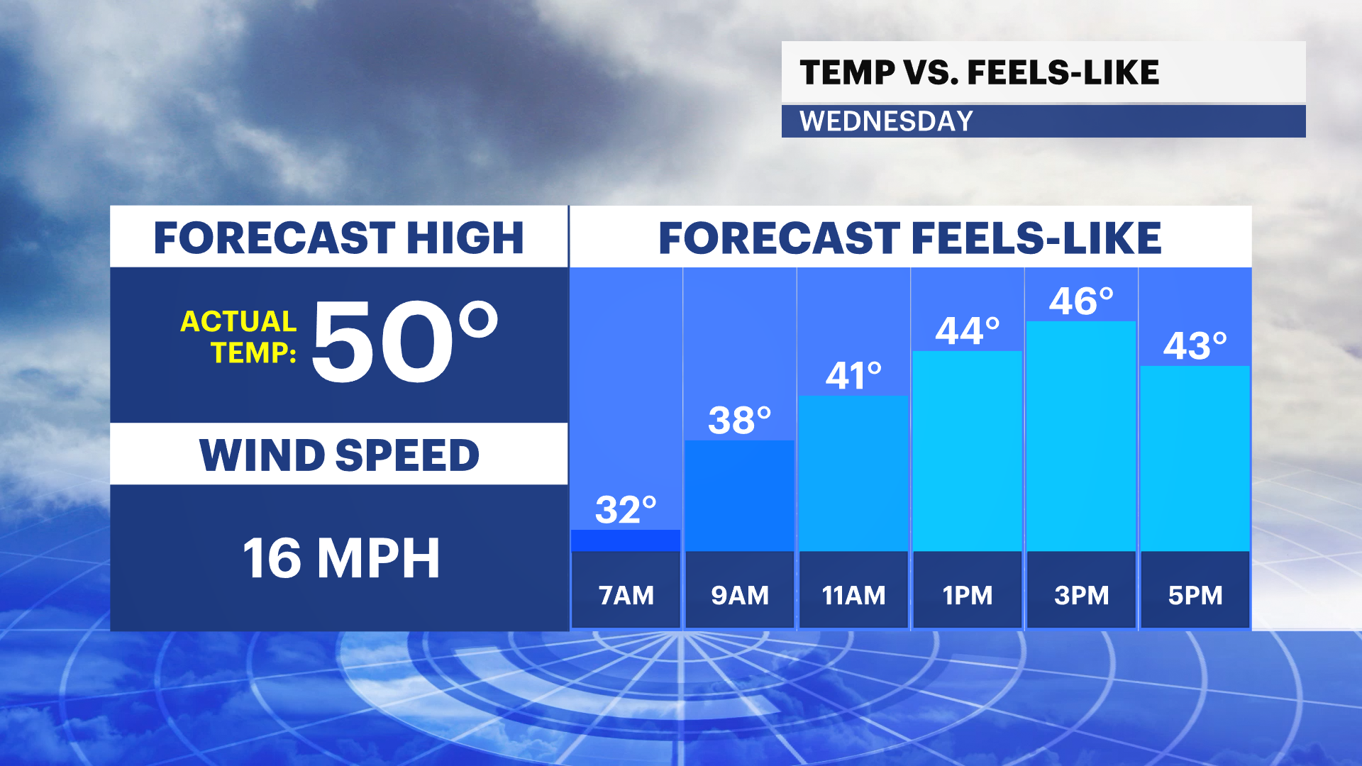 WEDNESDAY: Mainly cloudy with a few hints of sun possible. A stray shower cannot be ruled out mostly in the form of rain. It will not feel as cold as Tuesday, but still chilly. Highs around 50 degrees will feel like the 40s with a west-southwest wind around 10 to 20 mph with some gusts near 30 mph still. Lows near 40 degrees.