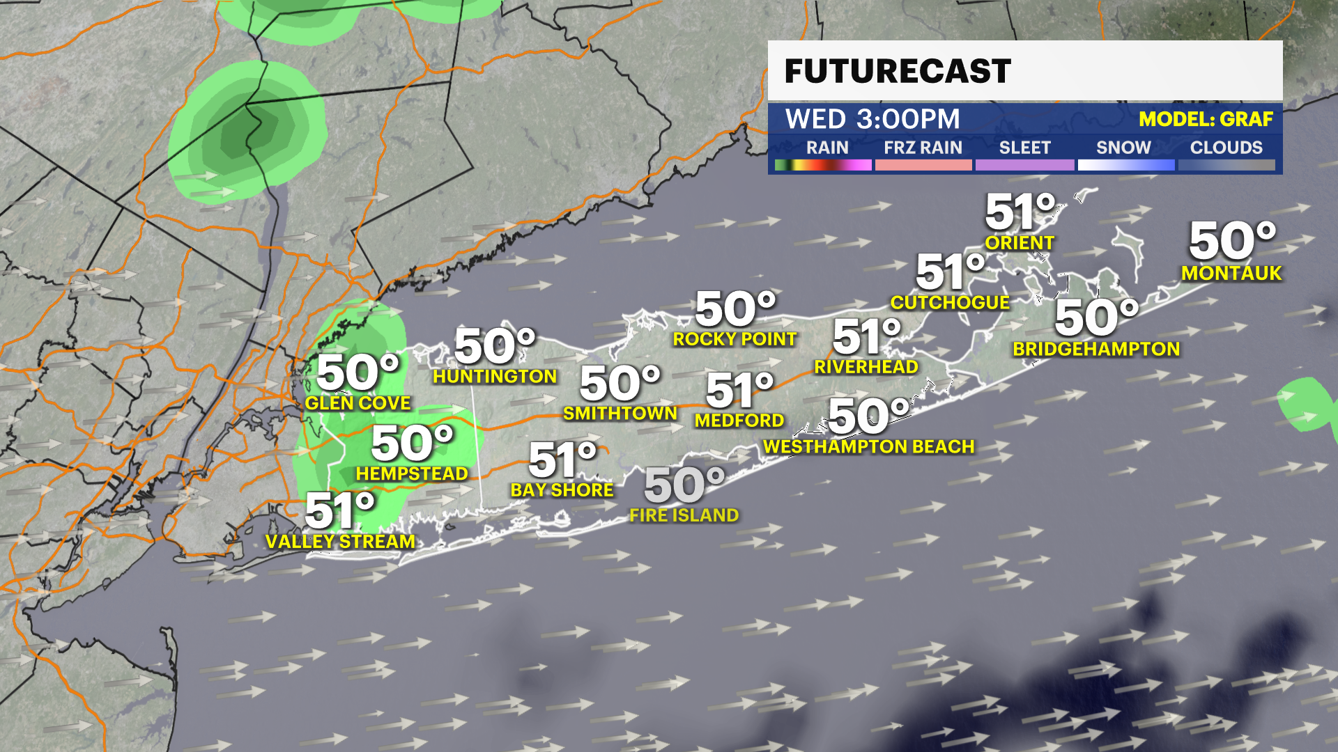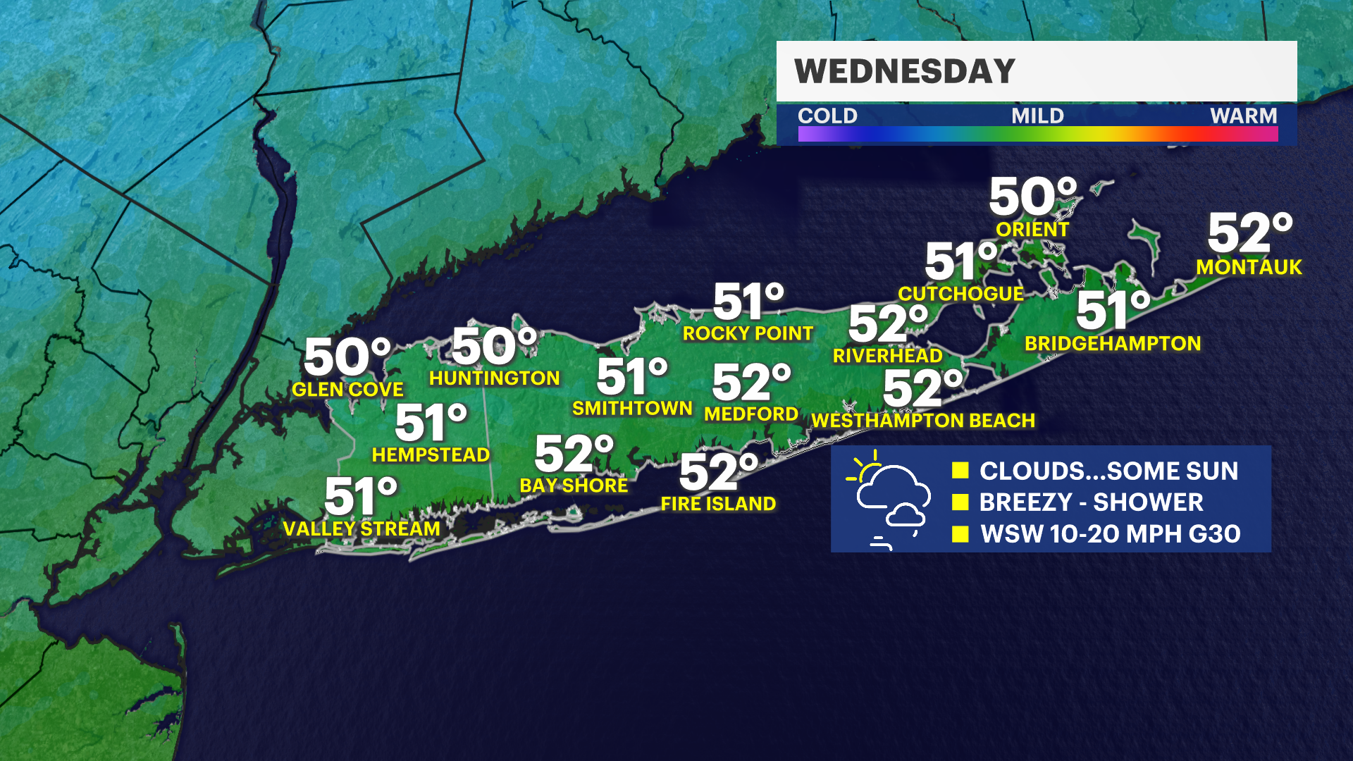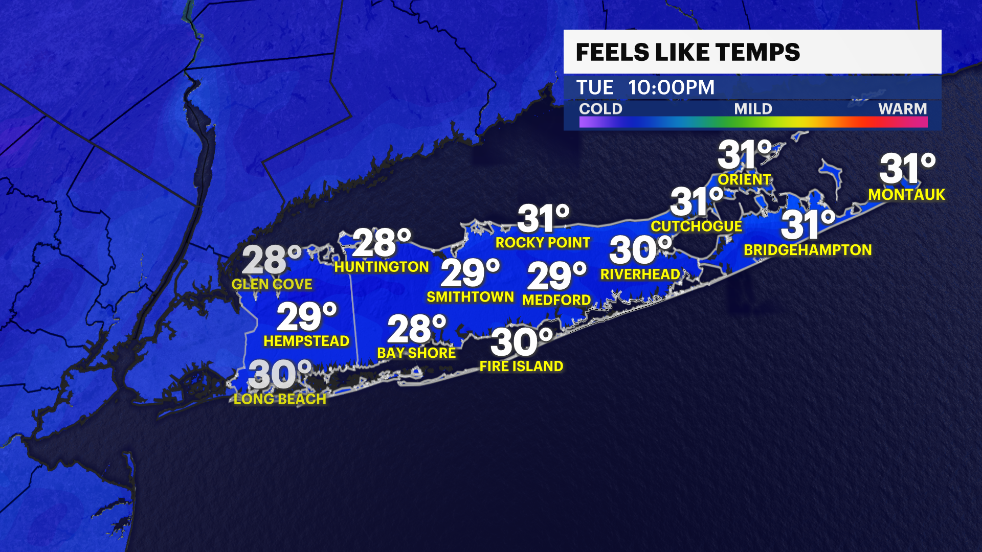TONIGHT: Dress warmly! Partly to mostly cloudy. A few more flurries cannot be ruled out, but most of the snow shower activity is over. The wind drops a bit overnight, but gusts can still reach around 30 mph. It will feel like the 20s into Wednesday morning with actual low temperatures around the mid-30s across most of Long Island.