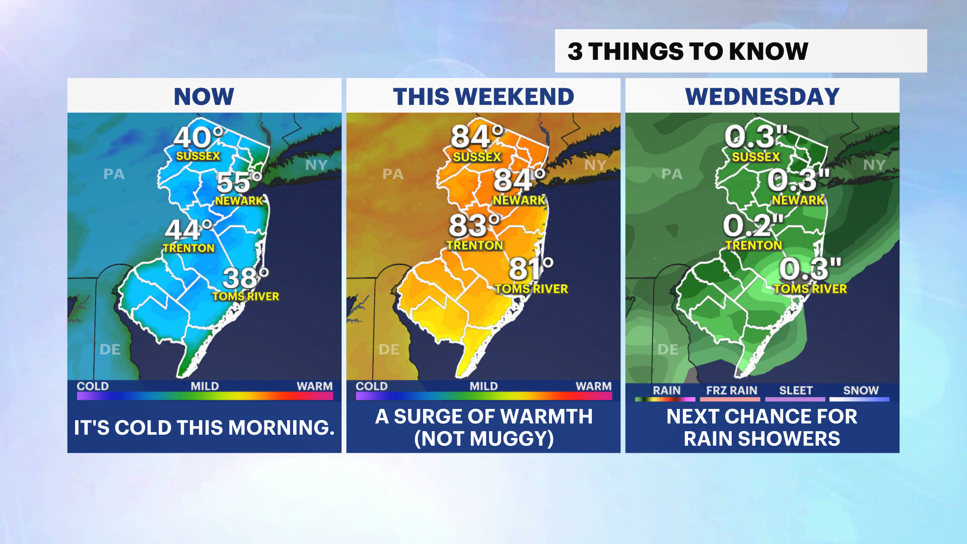 Warm weather continues into early next week with higher humidity for Monday and Tuesday. Rain showers are expected with a front on Wednesday afternoon as it delivers under 0.5 inches of rainfall as it passes through New Jersey.