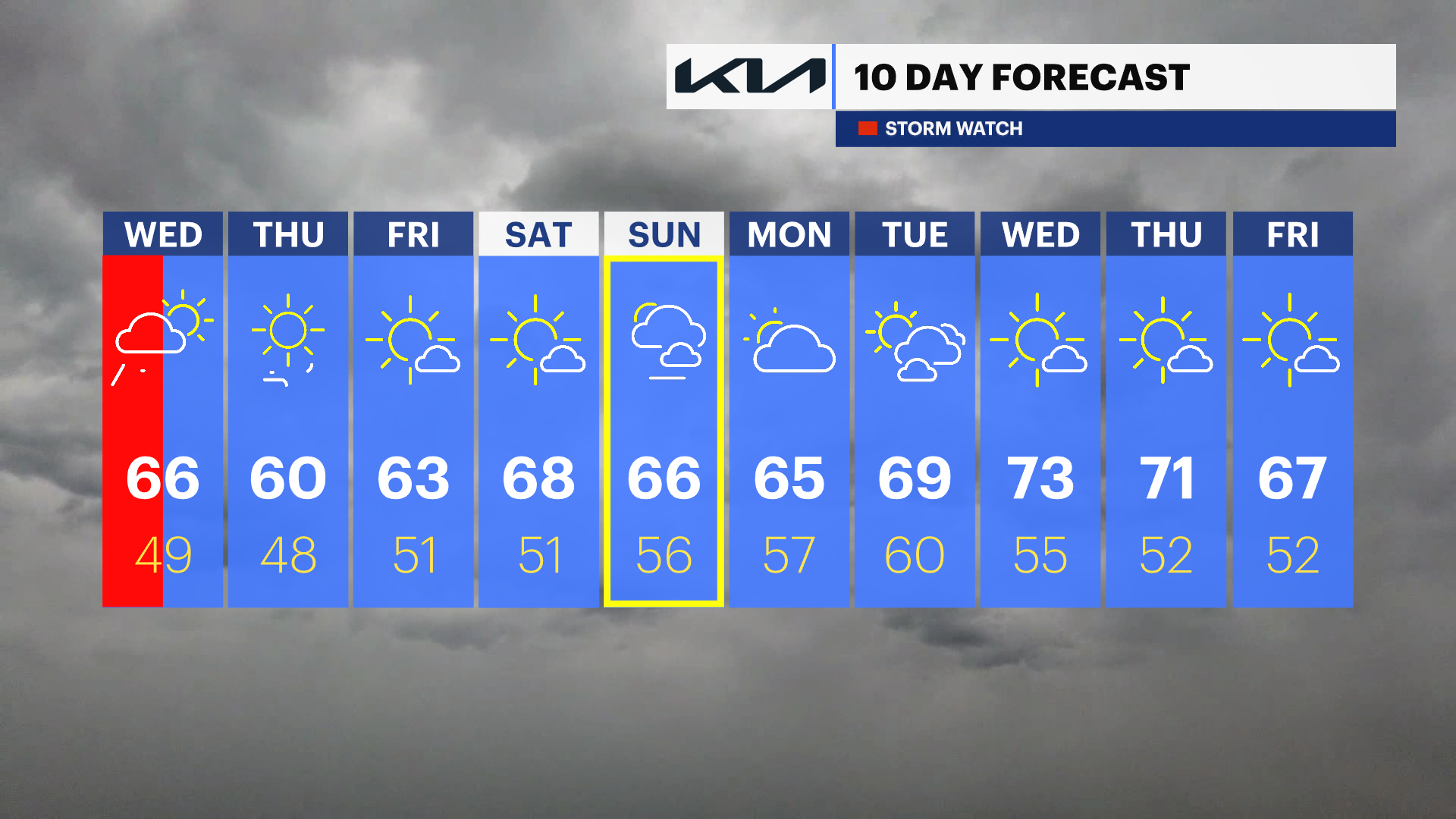 FRIDAY: Sunny with some clouds. Highs in the low 60s, lows in the high 50s.