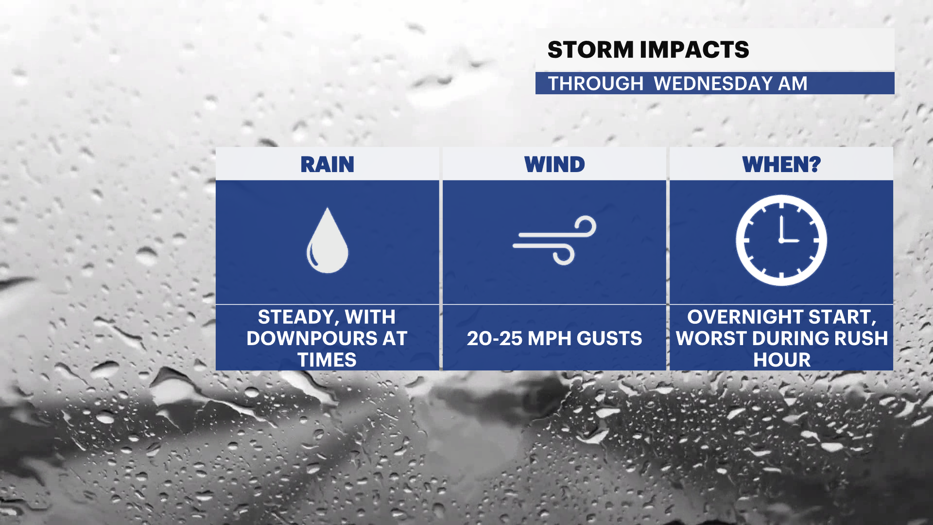 Rain returns! Steady and breezy showers continue throughout the overnight, and into the first half of Wednesday. The heaviest portions will move through between 5 a.m. and 9 a.m., making for a soggy and frustrating morning commute.
