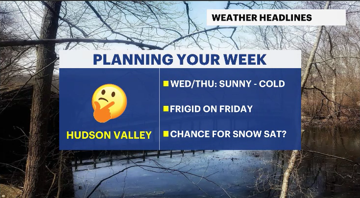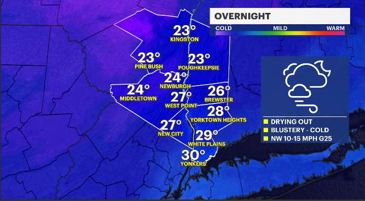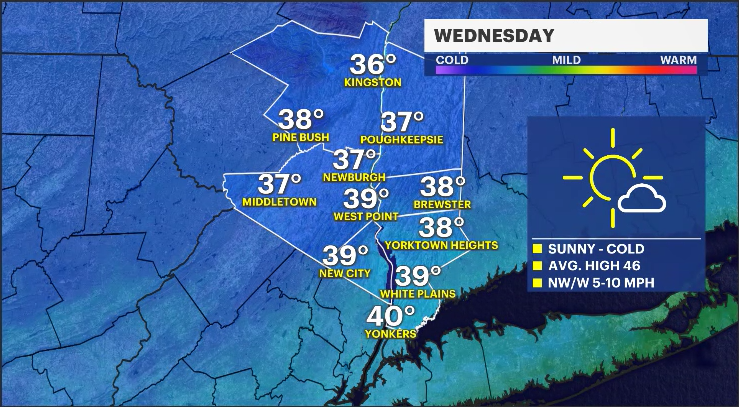 WEDNESDAY: Cold morning and afternoon. It will feel like the 20s and 30s throughout the day under mostly sunny skies. Highs will be far from normal in the upper 30s. The average high for White Plains is 47 degrees. Lows will be in the 20s.