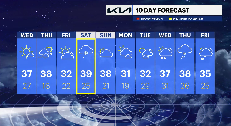 FRIDAY: Frigid morning and a very cold afternoon. There is a slight chance of a snow shower overnight early Saturday morning. Highs will be in the low 30s. Lows in the 20s. The average high temperature is 45 degrees.