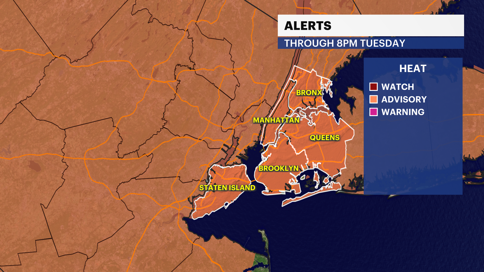 Storm Watch Team Meteorologist Darryl Green says a heat advisory will remain in effect for New York City through Tuesday night, as feel-like temperatures approach 100 tomorrow.