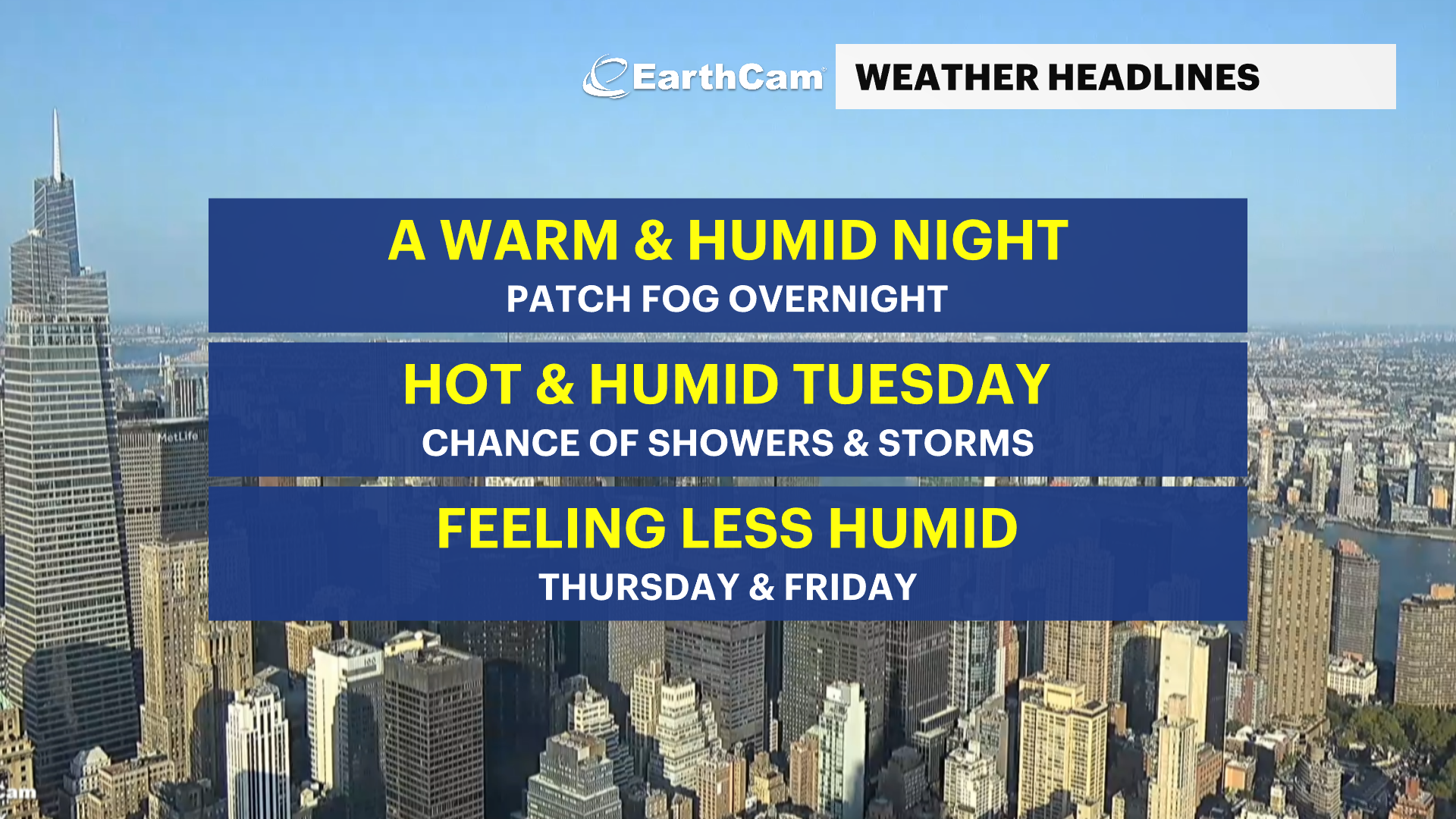 Wednesday: Mostly sunny, still very warm, but less humid. Highs from the mid to upper-80s.