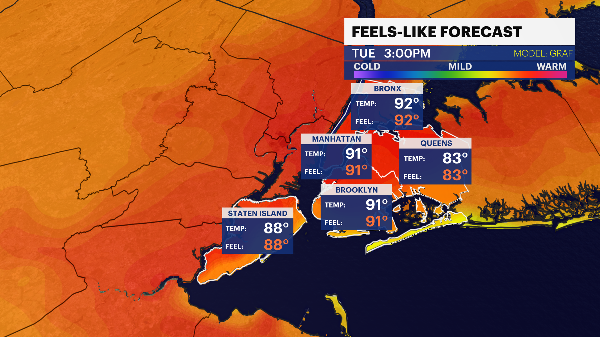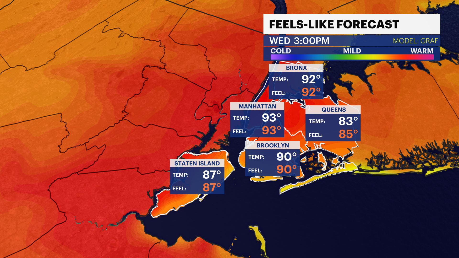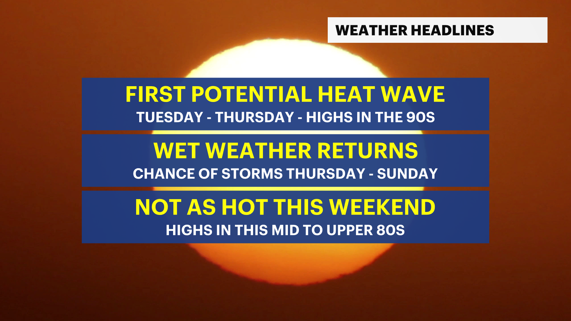 NEXT: Sunny, hot, hazy and humid Tuesday through Thursday. This could be start of our first potential heat wave of the season with highs in the 90s.