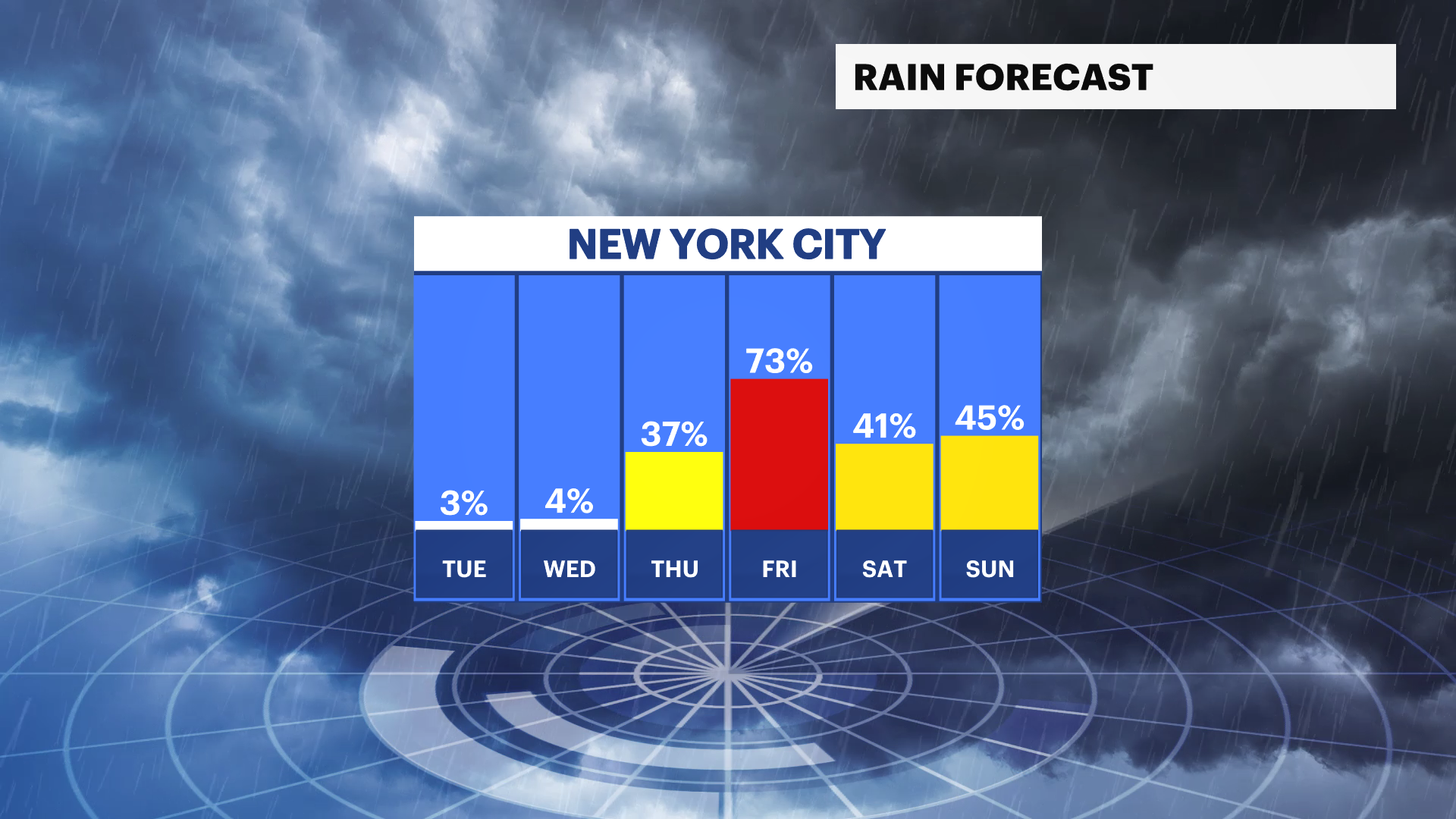 Friday: Partly sunny, very warm and still humid. Chance of storms. Highs near 85. Lows near 72.