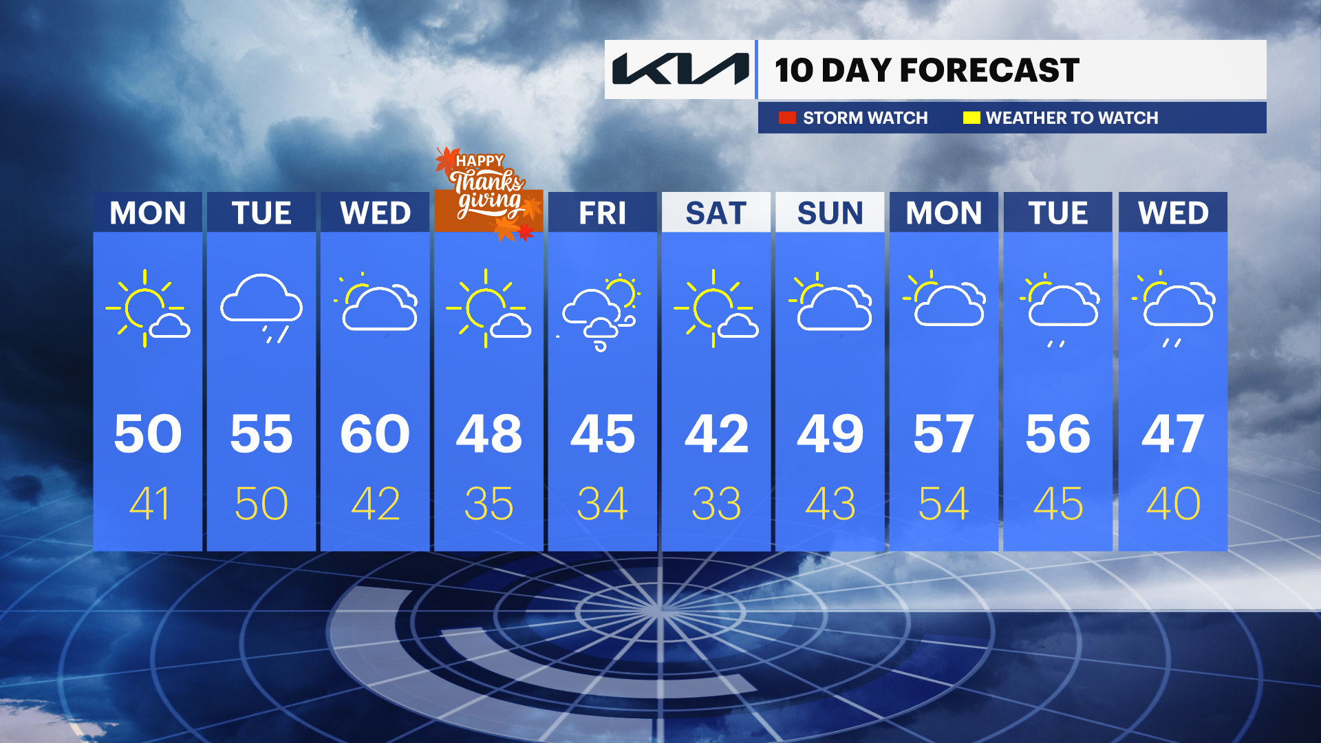 Thanksgiving Day: Mostly sunny and cooler again. Highs in the upper 40s. Great for morning travel or heading to the parade.