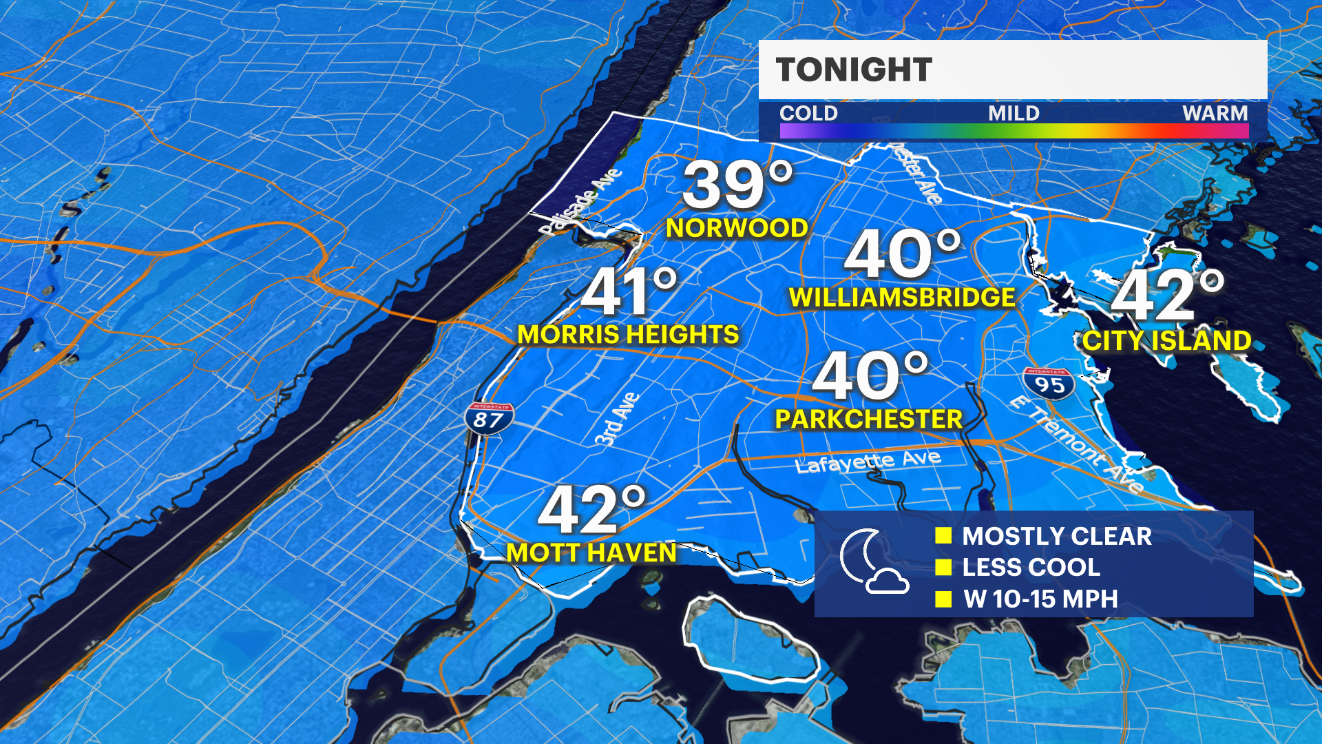 Tonight: Mostly clear and cool with temperatures dipping to the low 40s and a steady west breeze around 10 mph.