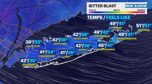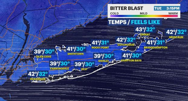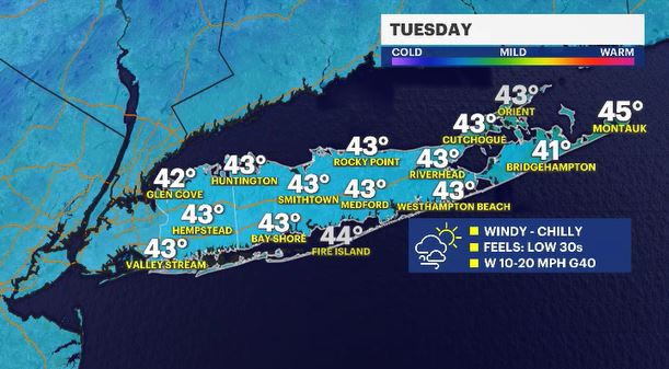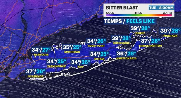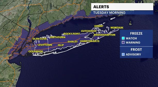 • For Nassau and Suffolk counties Tuesday morning from 1 a.m. - 9 a.m., temps will go down as low as the low-30s. Sub-freezing temperatures could harm or kill sensitive outdoor vegetation and pets that like to stay outside.