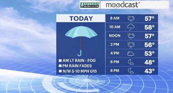 TODAY: Rain tapers off during midday hours. Sunny breaks are expected this afternoon and then a drop in temps after a cold front passes. Temps will start to feel chilly after sunset. Highs: mid-50s.