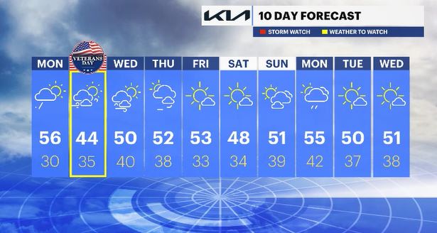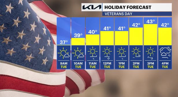 TUESDAY: BITTER BLAST - VETERANS DAY - Mix of sun and clouds with gusty winds at times. Temps will feel into the low-30s in the afternoon. Highs: low- to mid-40s. Lows: mid 30s.