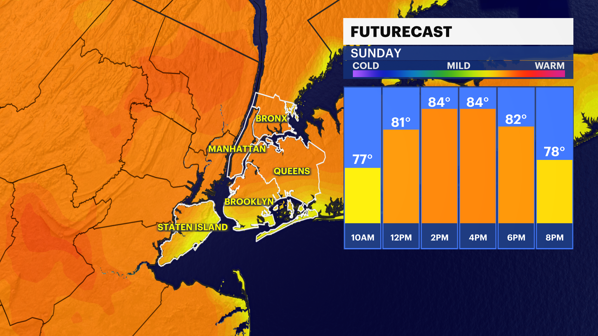 THURSDAY: Mostly sunny and hot again. Highs up to 88 and could reach 90. Lows