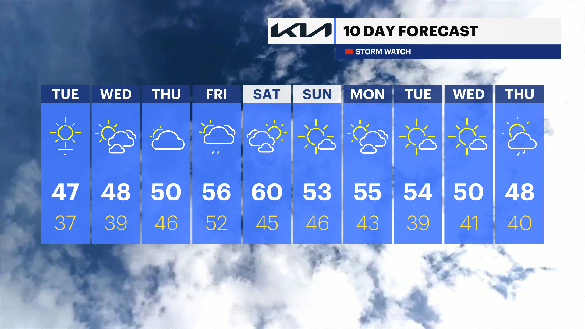 Sunday: Seasonable and mostly sunny. Breezy. Highs near 52. Lows near 41.