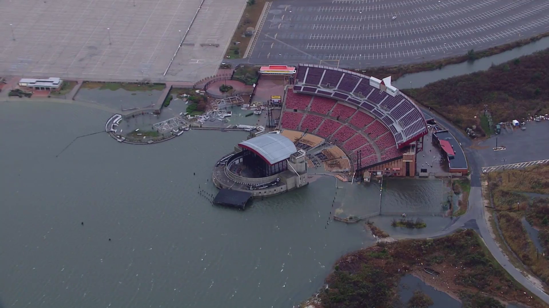 Photo from Chopper 12 video shows the amphitheater at Jones Beach flooded and severely damaged by Superstorm Sandy.