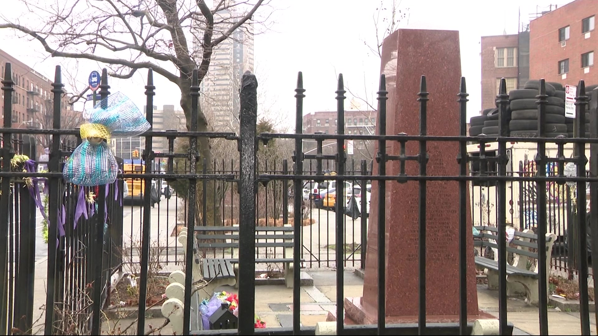 A memorial to those killed in the Happy Land social club fire is displayed in a small park across the street from the former club's location.
