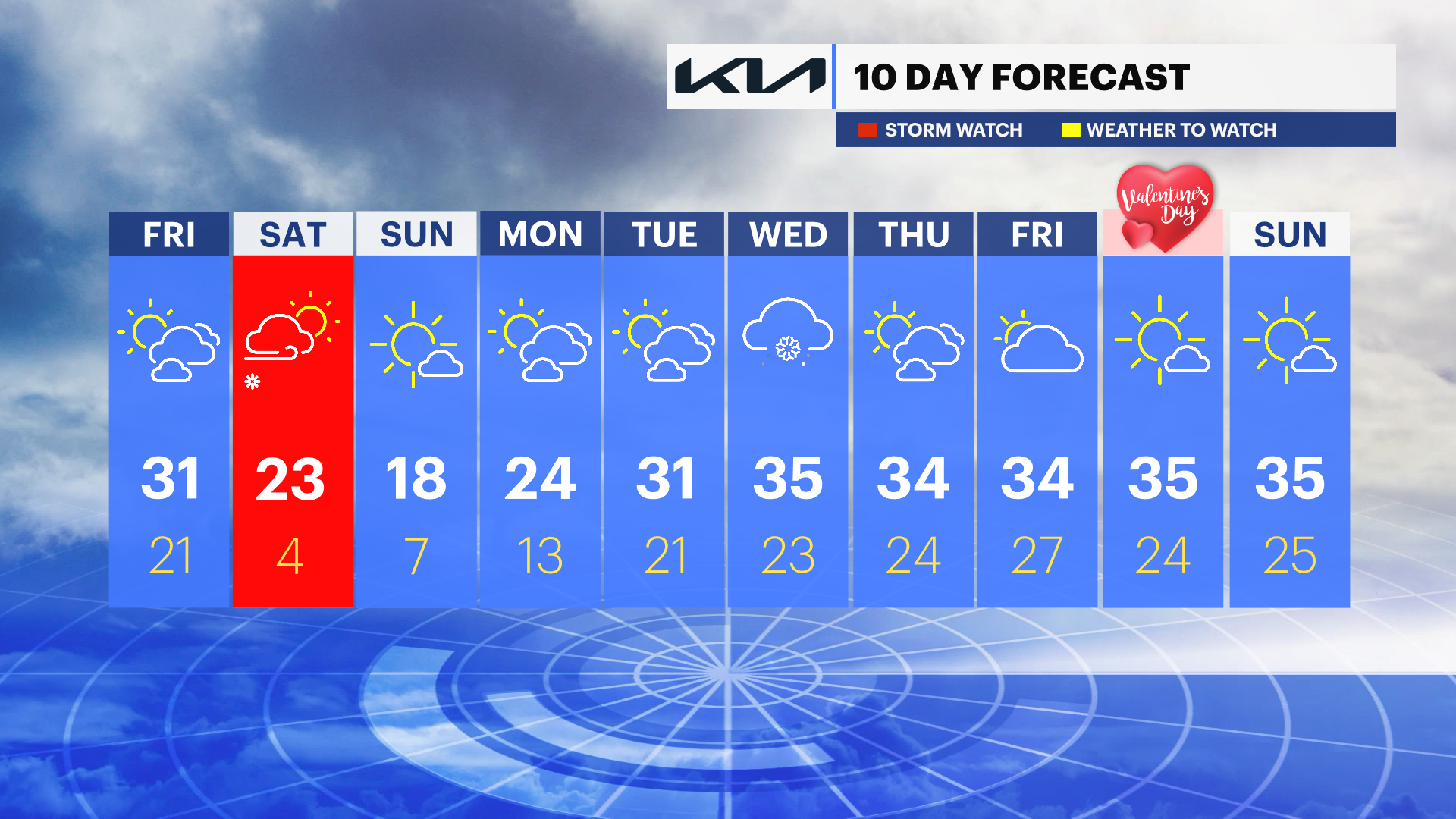 The coldest-feeling air of the weekend will be Sunday morning with wind chills around -10 to -20 degrees. This is potentially life-threatening cold if you are not careful. Cold-weather-related health impacts like frostbite and hypothermia can develop in less than 15 minutes. Please avoid as much exposure to the cold during this time and dress in layers. That said, it will be dry if you are heading to festivities for the big game! Just watch out for some lingering icy conditions on the roads.
