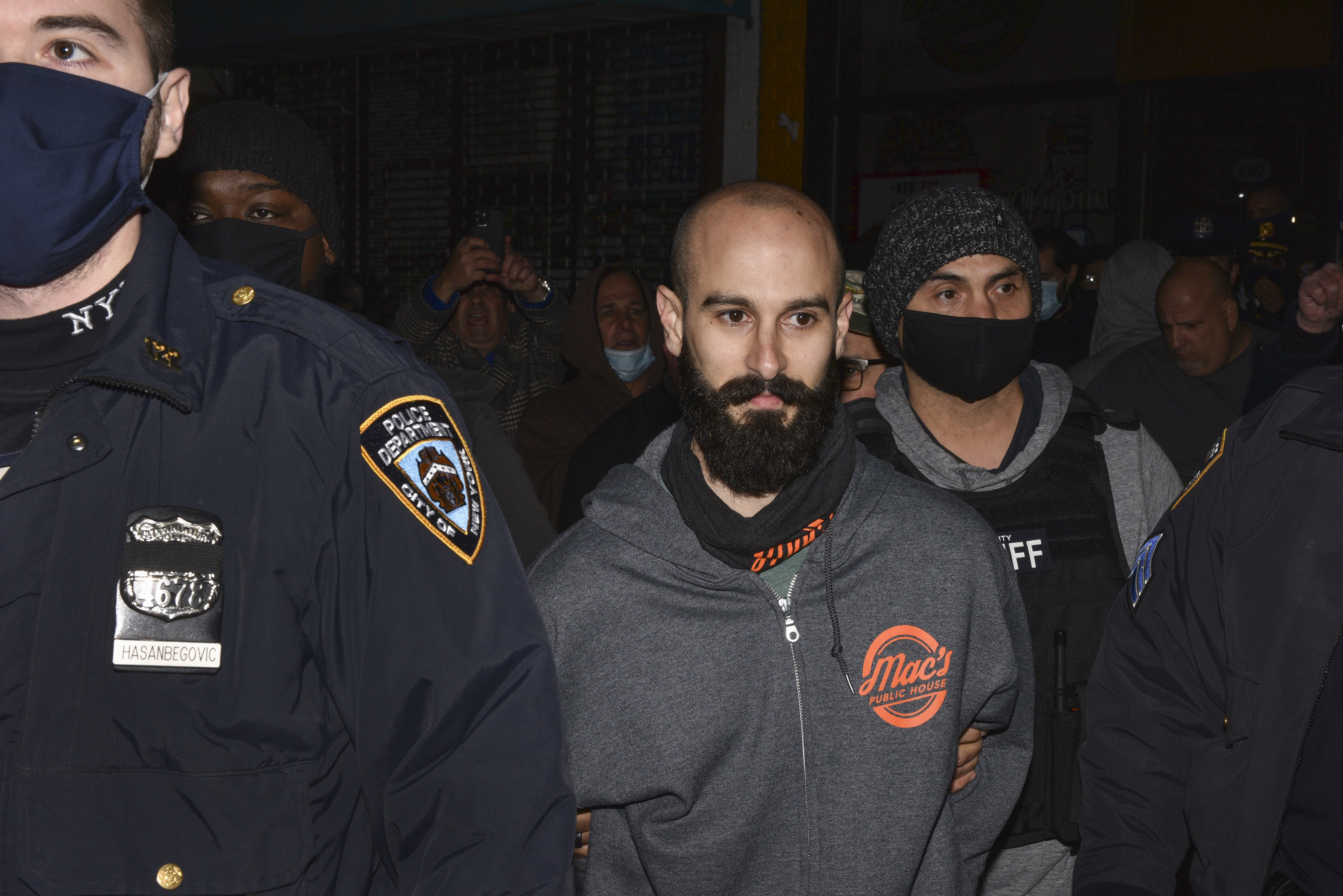 Mac's Public House co-owner Danny Presti is taken away in handcuffs after being arrested by New York City sheriff's deputies, Tuesday, Dec. 1, 2020. (Steve White via AP)