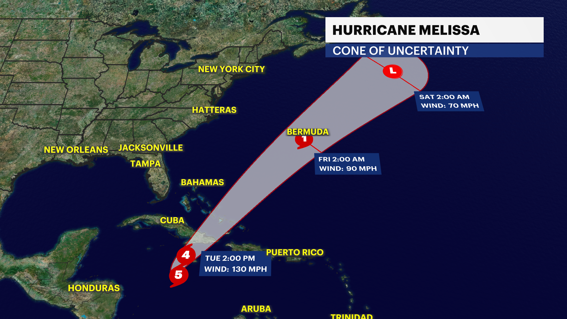 Saturday: Sun and clouds, cool and breezy. Highs near 58. Lows near 45. Sunday: Partly sunny and cool. Less wind. Highs near 59. Lows near 47. TRACKING THE TROPICS: Hurricane Melissa continues to strengthen as it approaches Jamaica. It is currently a Category 5 hurricane . This will be the first time ever in recorded history a Category 5 hurricane makes landfall in Jamaica. The strongest hurricane to ever hit Jamaica was at category four storm in 1988. 2-3ft of rainfall will bring catastrophic flooding and landslides to the island. Destructive winds will bring power outages and extensive infrastructural damage for days and even weeks. Significant storm surge of 9 - 13 ft is expected through tomorrow morning along the Eastern portions of Jamaica. Haiti and the Dominican Republic will continue to face Melissa's wrath as it slowly moves north and wraps around more heavy rainfall and damaging winds to the neighboring islands. Eastern Cuba, Turks and Caicos and the Bahamas will be the next areas of concern as hurricane Melissa continues its northern path Tuesday and Wednesday.