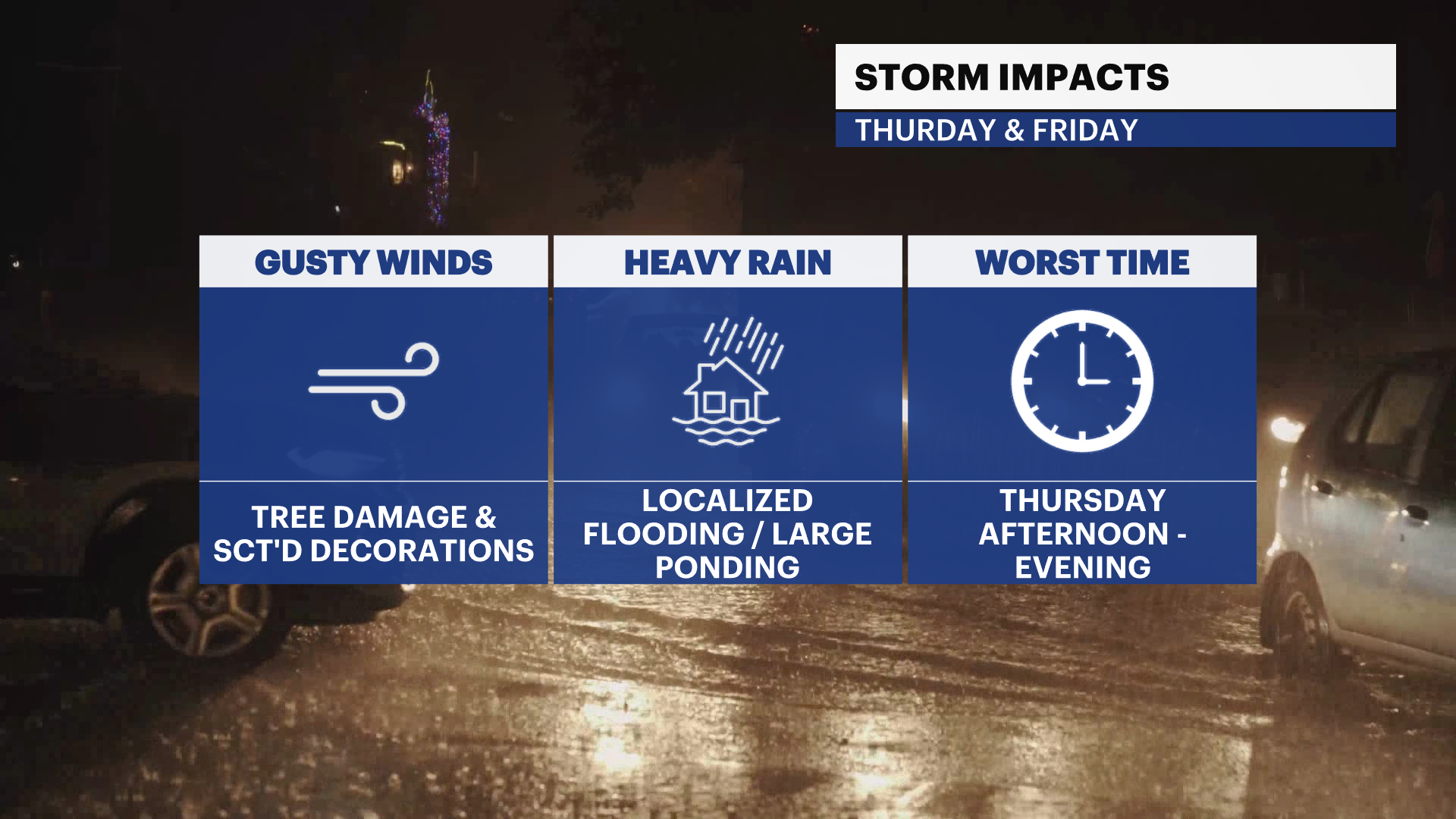 Thursday: Windswept rain, much cooler. Highs near 57. Lows near 48.
