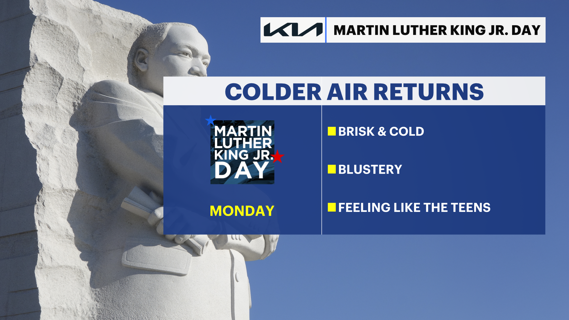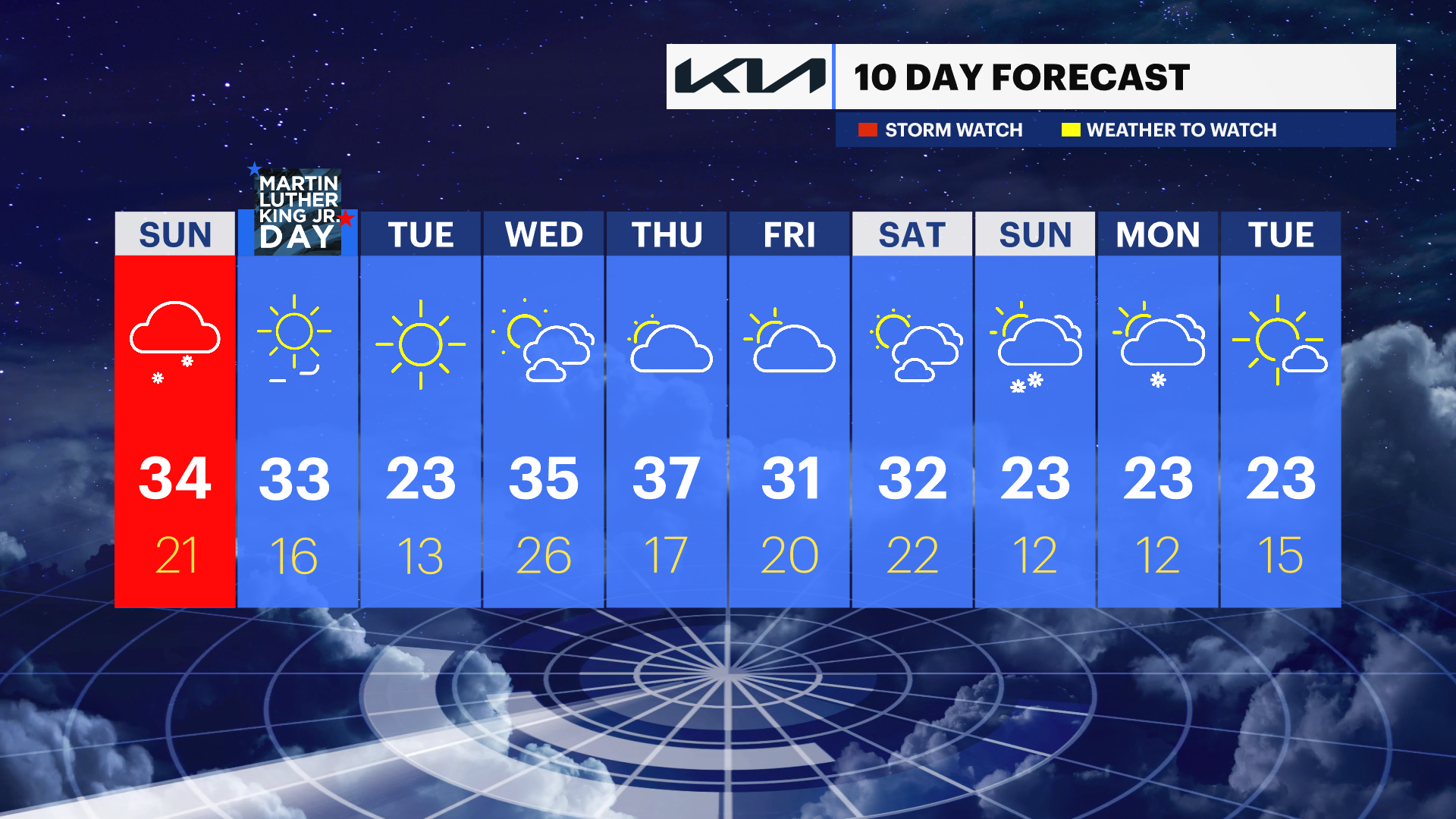 Expect 2-3" of snow Sunday before bitter cold arrives for the week. Monday night into Tuesday will be the coldest stretch, with highs staying below freezing. Below-average temperatures persist all week, with slight precipitation chances by next weekend.