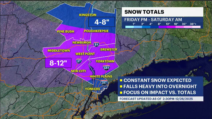 OVERNIGHT: Expect very cold, steady snowfall with heavy periods of snowfall rates of 1 to 2 inches per hour. Four to 8 inches for most of the region is expected with 8 inches to a foot possible for areas north of Westchester and Rockland counties. Visibility will be very low. Expect snow-covered roads and slippery walkways. Lows in the 20s.