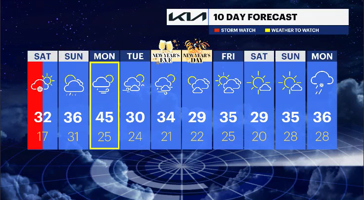 MONDAY: Cloudy. Rain is likely, with breezy conditions along with much milder temperatures. Rain is expected to end by evening. Highs in the 40s. Lows in the 20s.