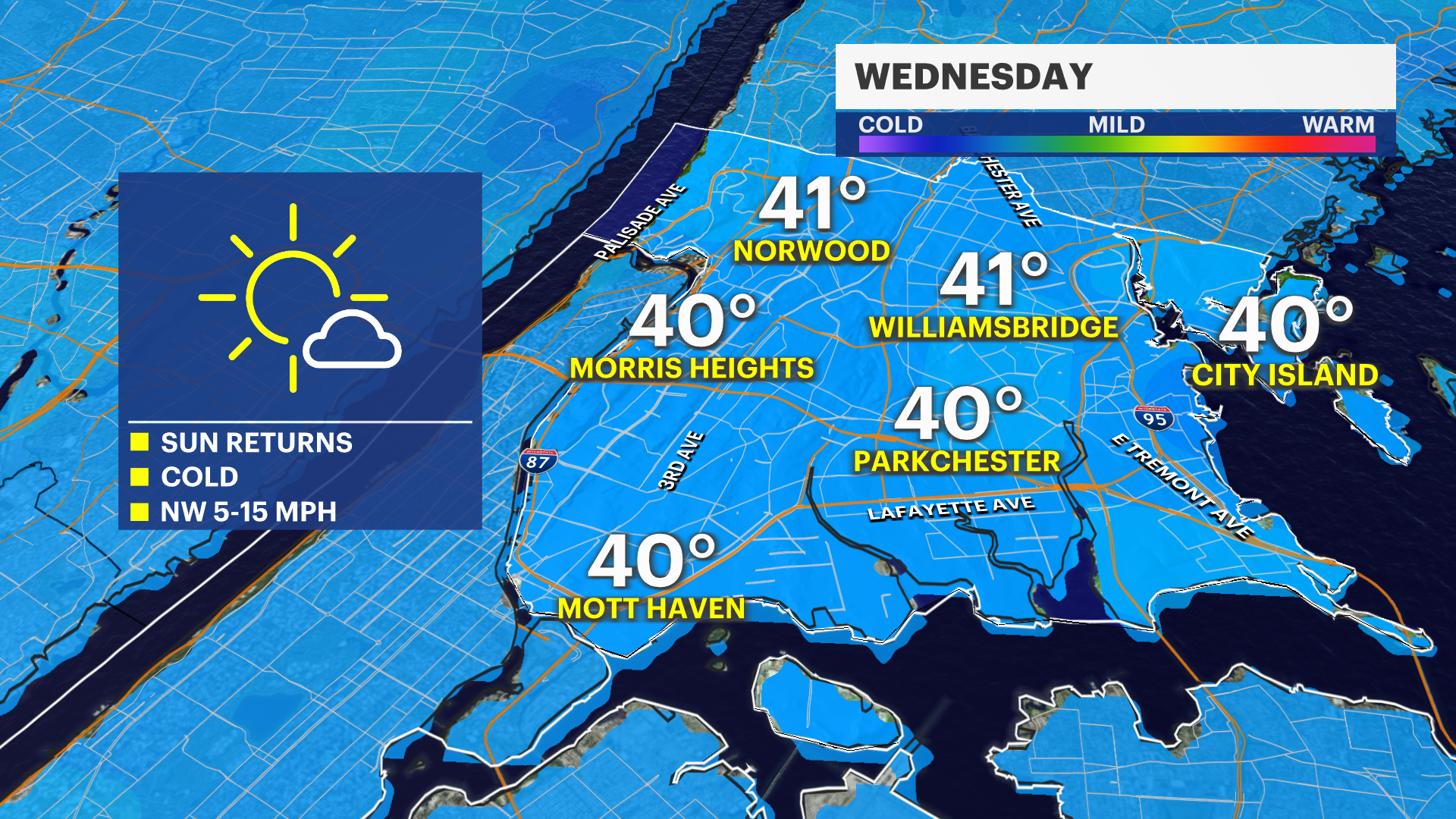 WEDNESDAY: Sun and clouds. Highs in the low 40s. Lows in the low 30s.