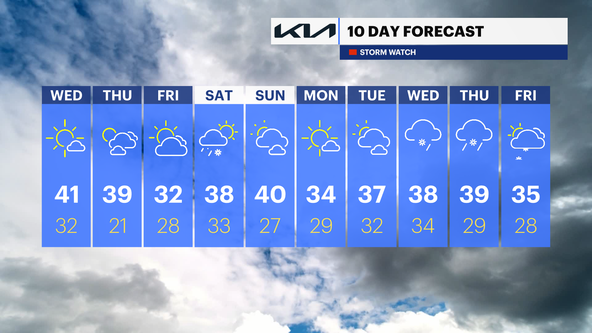 WEEKEND: Highs in the high 30s and low 40s, lows in in the high 20s and low 30s.