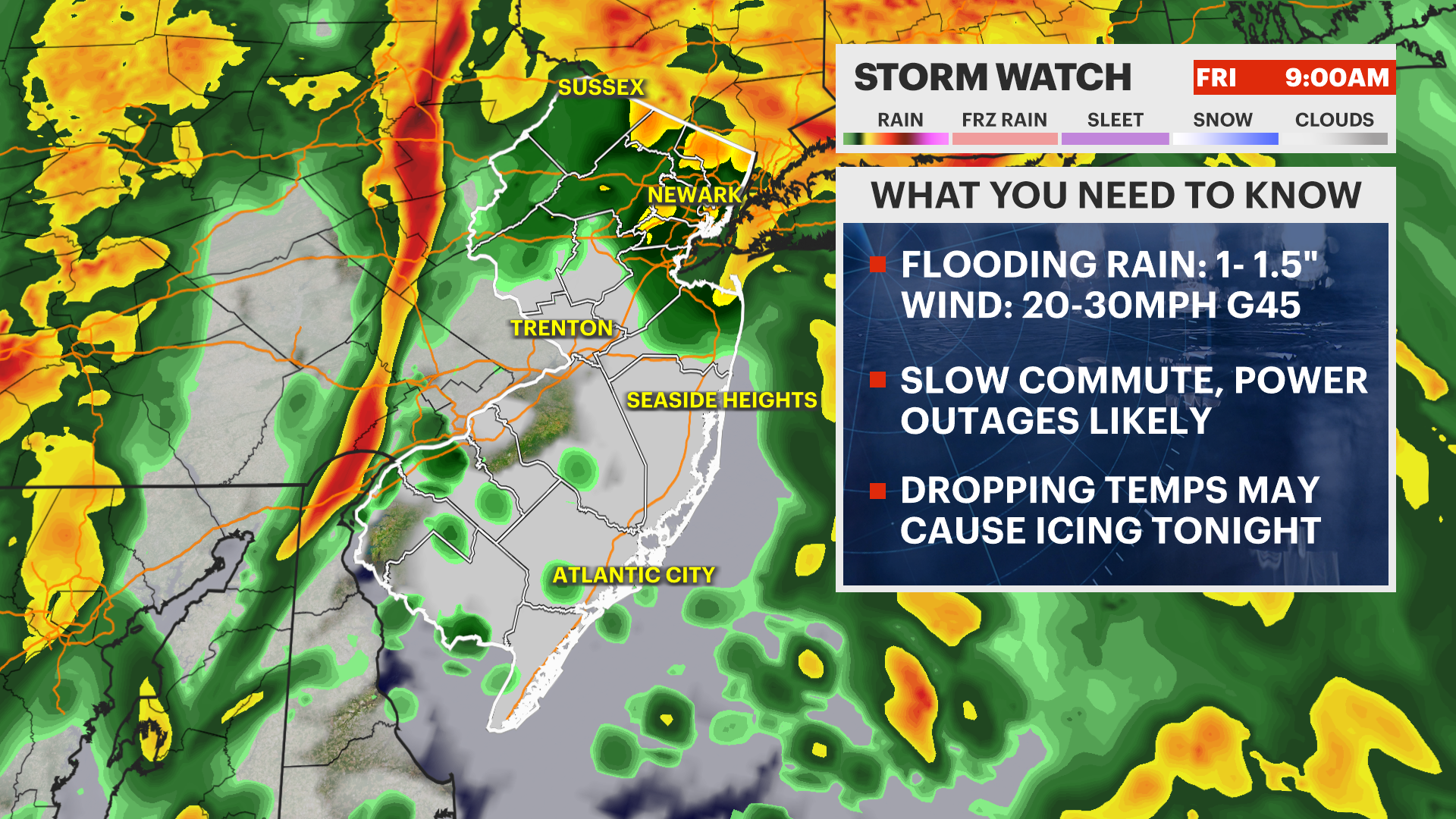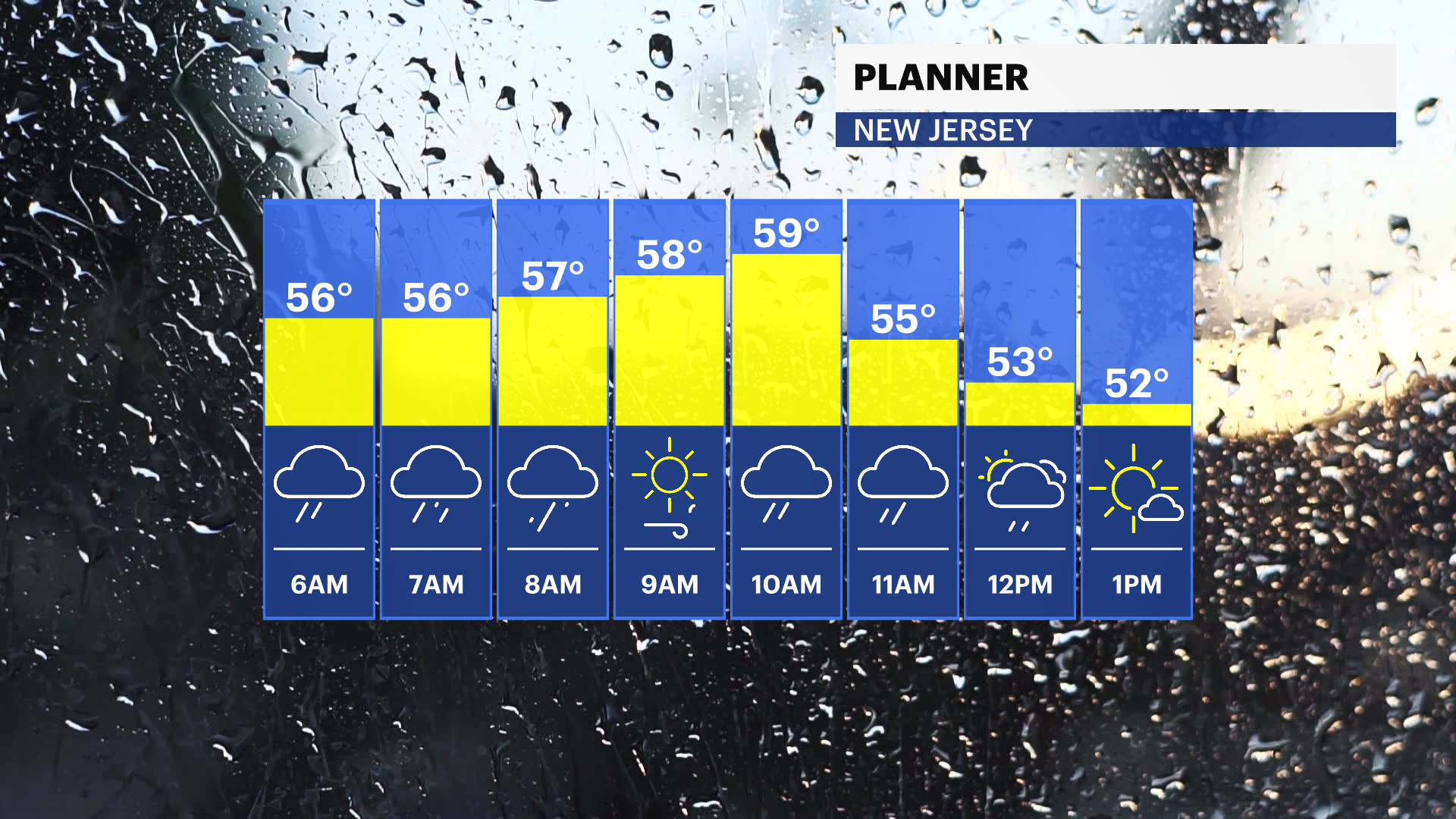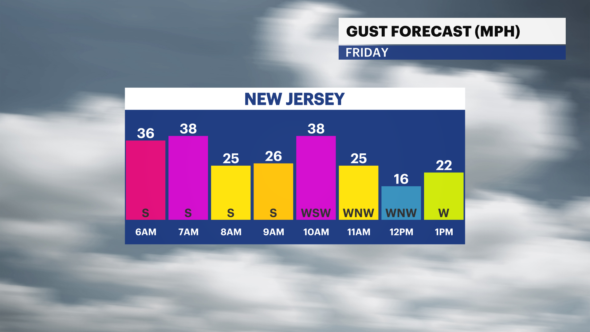 The active play of two fronts shapes our weather story in the Garden State today. First, a warm front, strong gusts from the south bring wind and heavy downpours early morning into the afternoon. Towards the late the morning, rumbles of thunder could be on the horizon, as a prelude to another front. A cold front arrives around 9 A.M.-10 a.m. shifting wind, pushing away rain eastward.