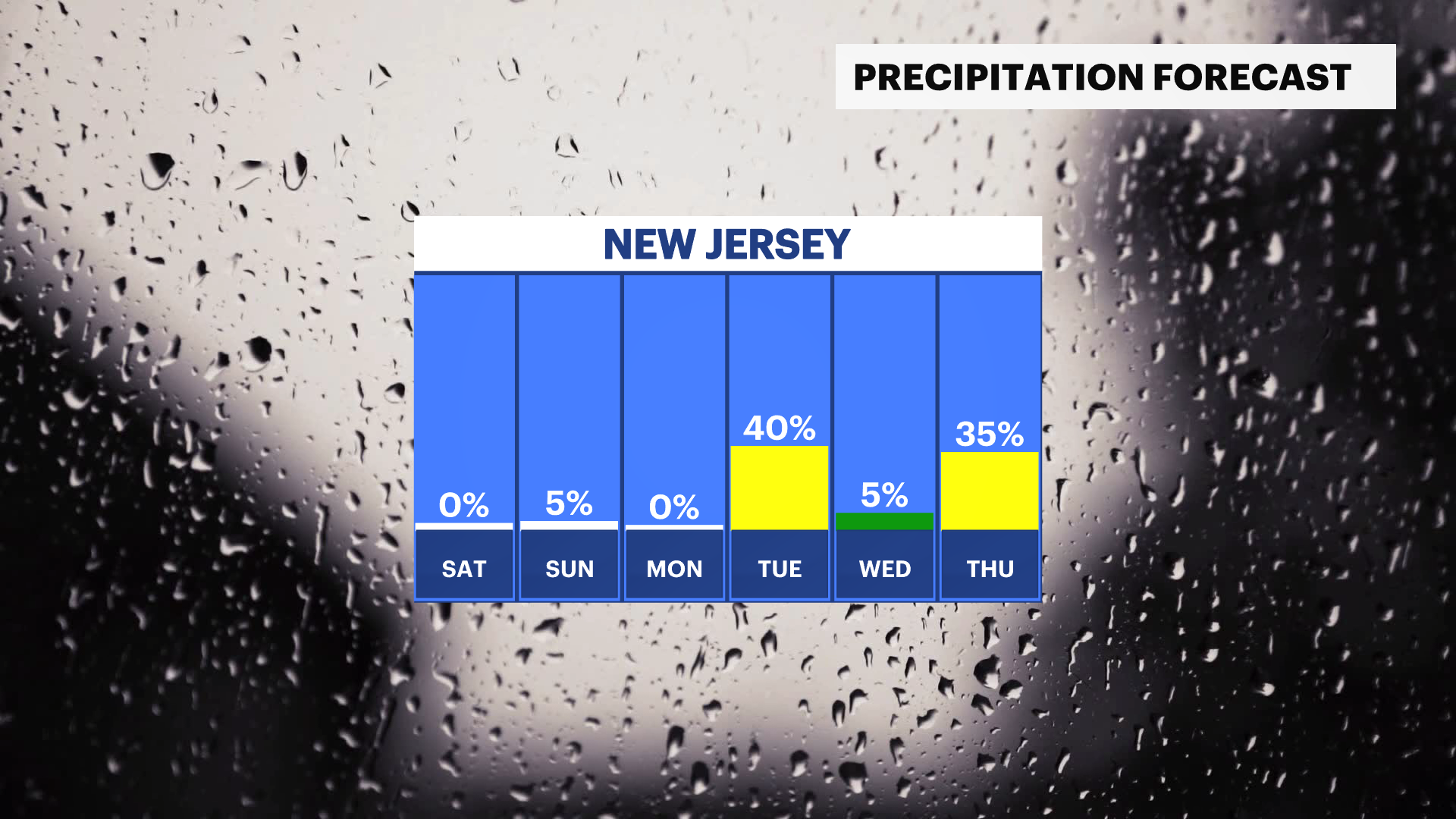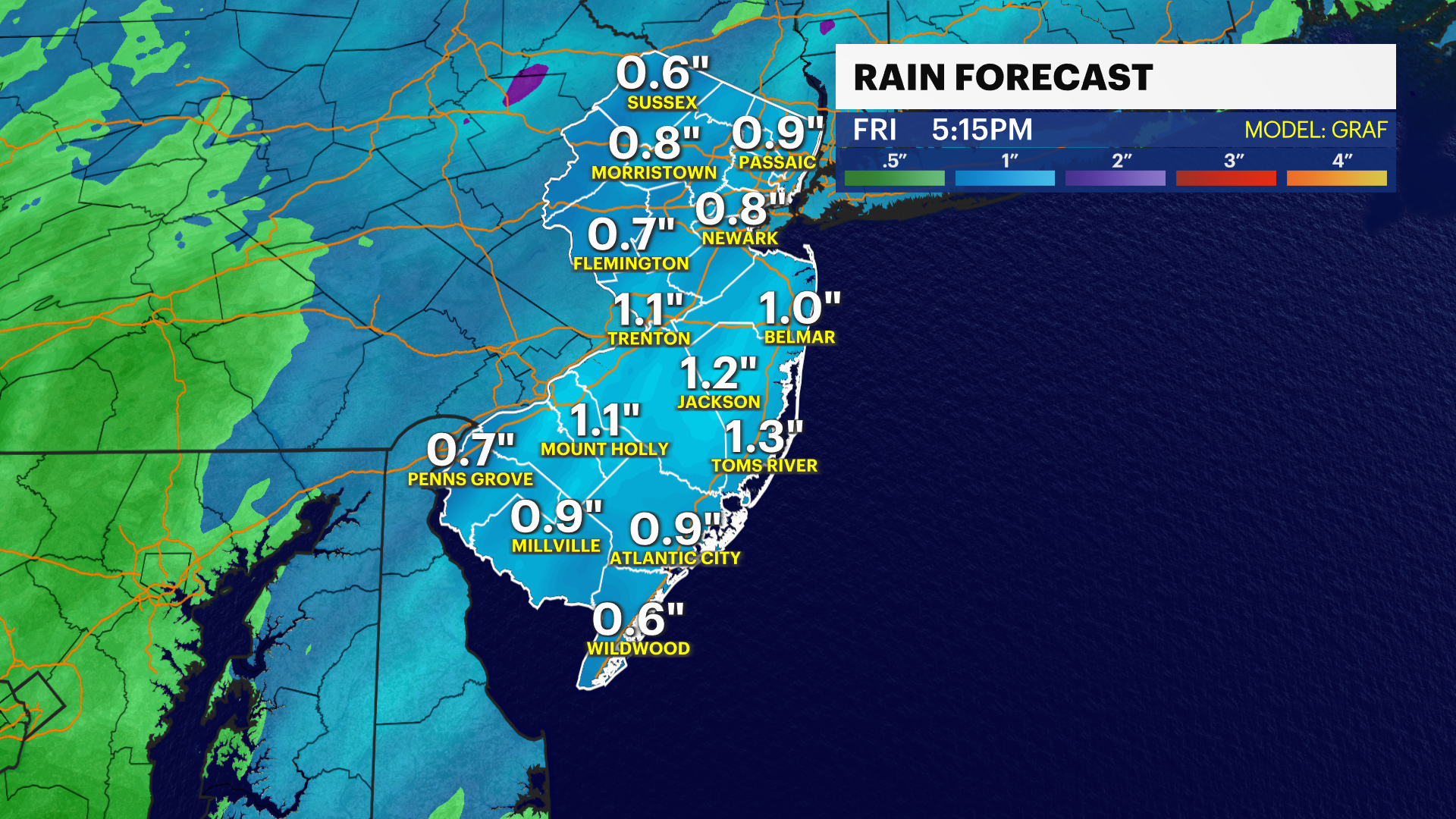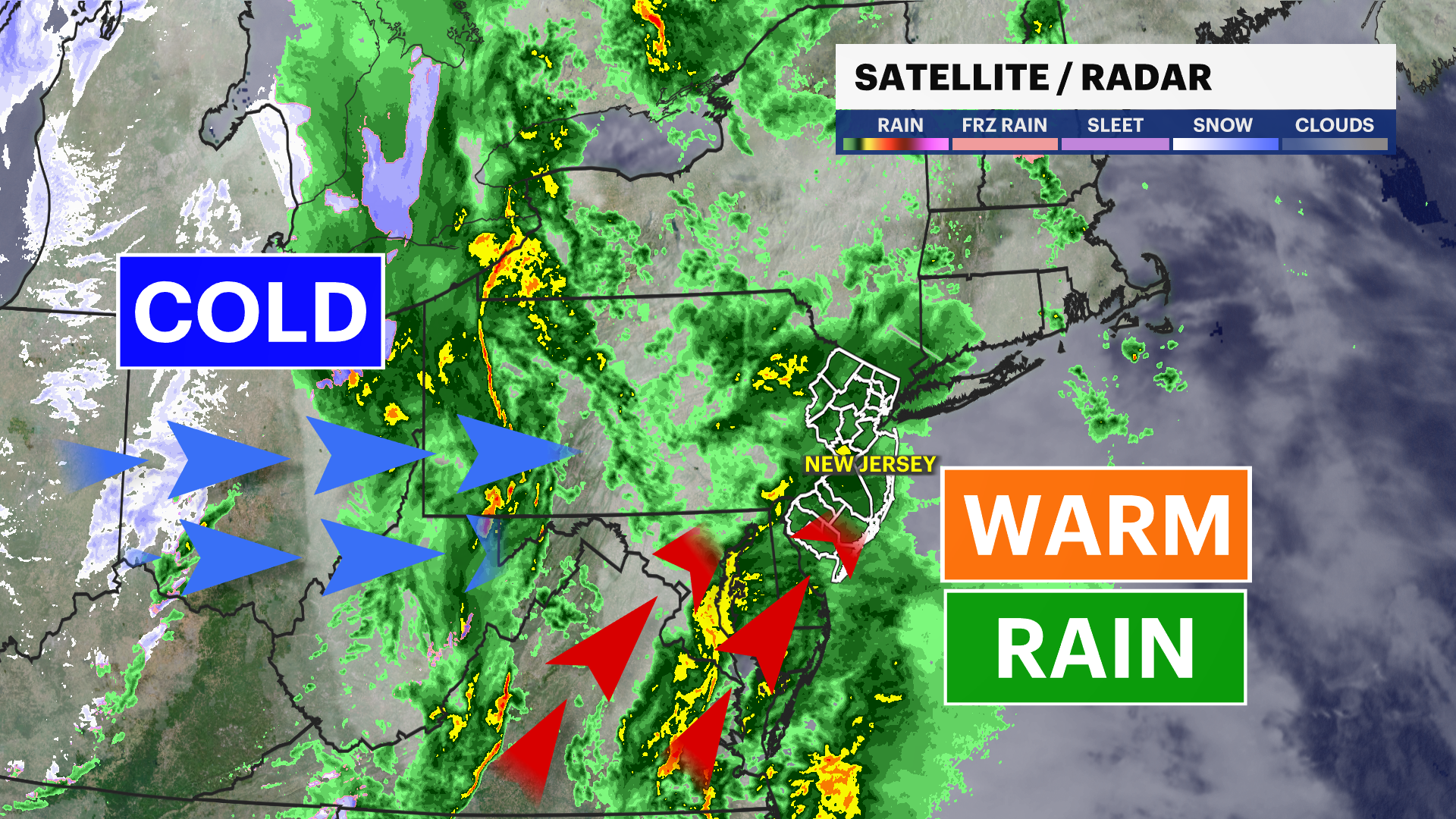 The active play of two fronts shapes our weather story in the Garden State today. First, a warm front, strong gusts from the south bring wind and heavy downpours early morning into the afternoon. Towards the late the morning, rumbles of thunder could be on the horizon, as a prelude to another front. A cold front arrives around 9 A.M.-10 a.m. shifting wind, pushing away rain eastward.