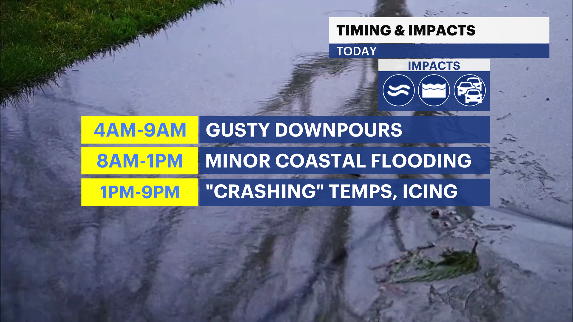 Dry, arctic air settles in with active winds from the west and north. Dramatic cold air "crashes" our temps to the freezing mark by 9 p.m. Feels-like temps hover 13-20 degrees.