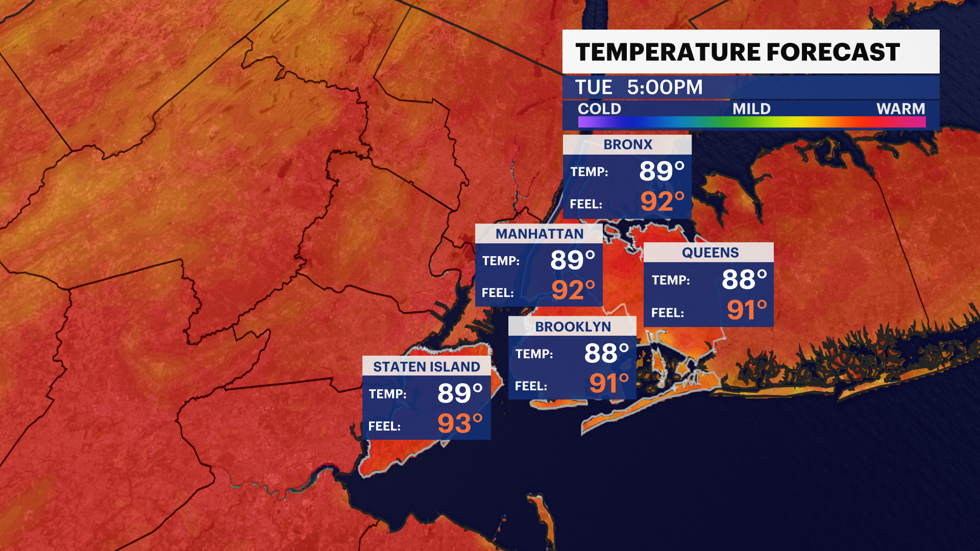 TUESDAY: Mostly sunny and hot. Highs jump to 90. Feels like 92 to 94. Lows near 75.