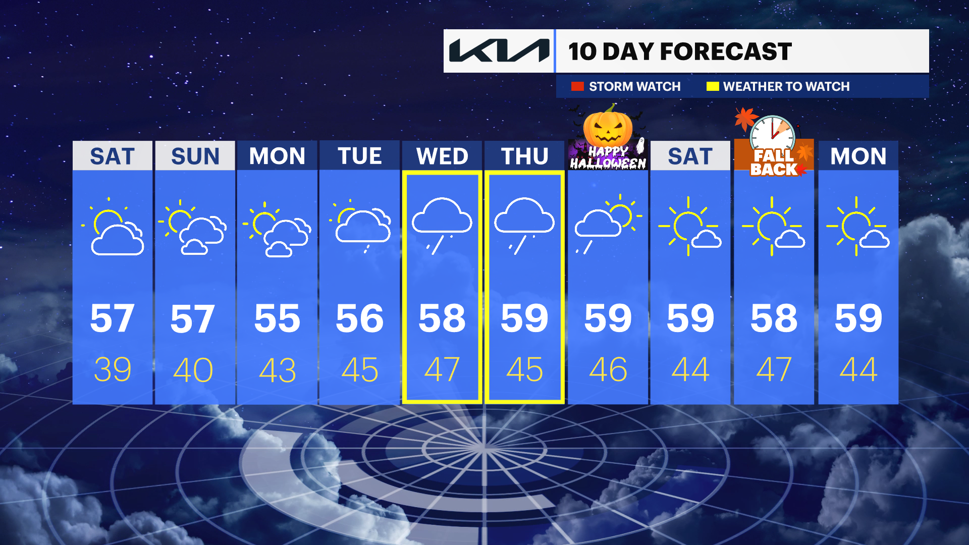 HALLOWEEN FRIDAY: Showers may linger, but mostly for the morning. The recent trends for trick-or-treating time look a bit better as drier weather may move in during the afternoon. Highs around 59 degrees. Lows near 46 degrees.