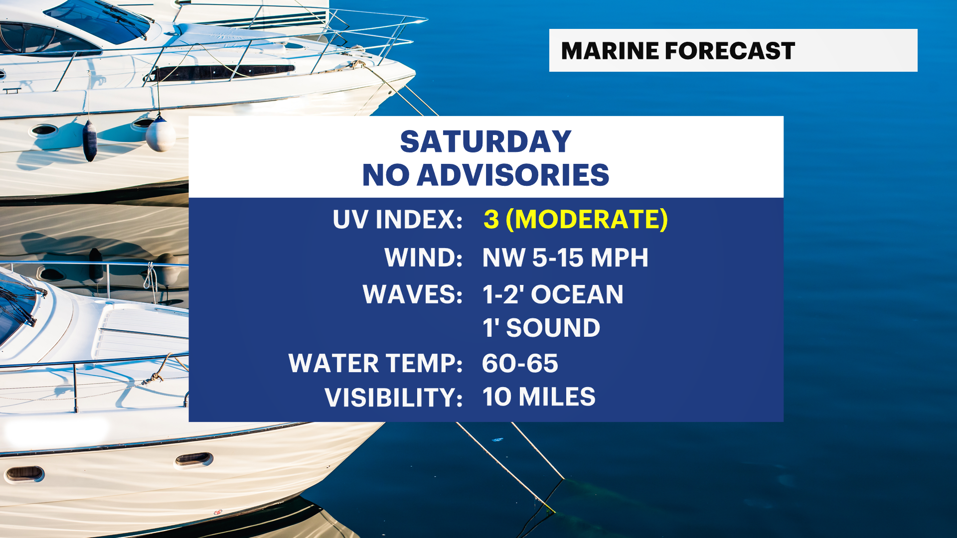 SATURDAY: Mostly sunny to partly cloudy. Highs around 57 degrees. Cold at night with lows near 39 degrees. Areas of frost possible, especially in and around the Pine Barrens. Lows there will be in the low to mid-30s.