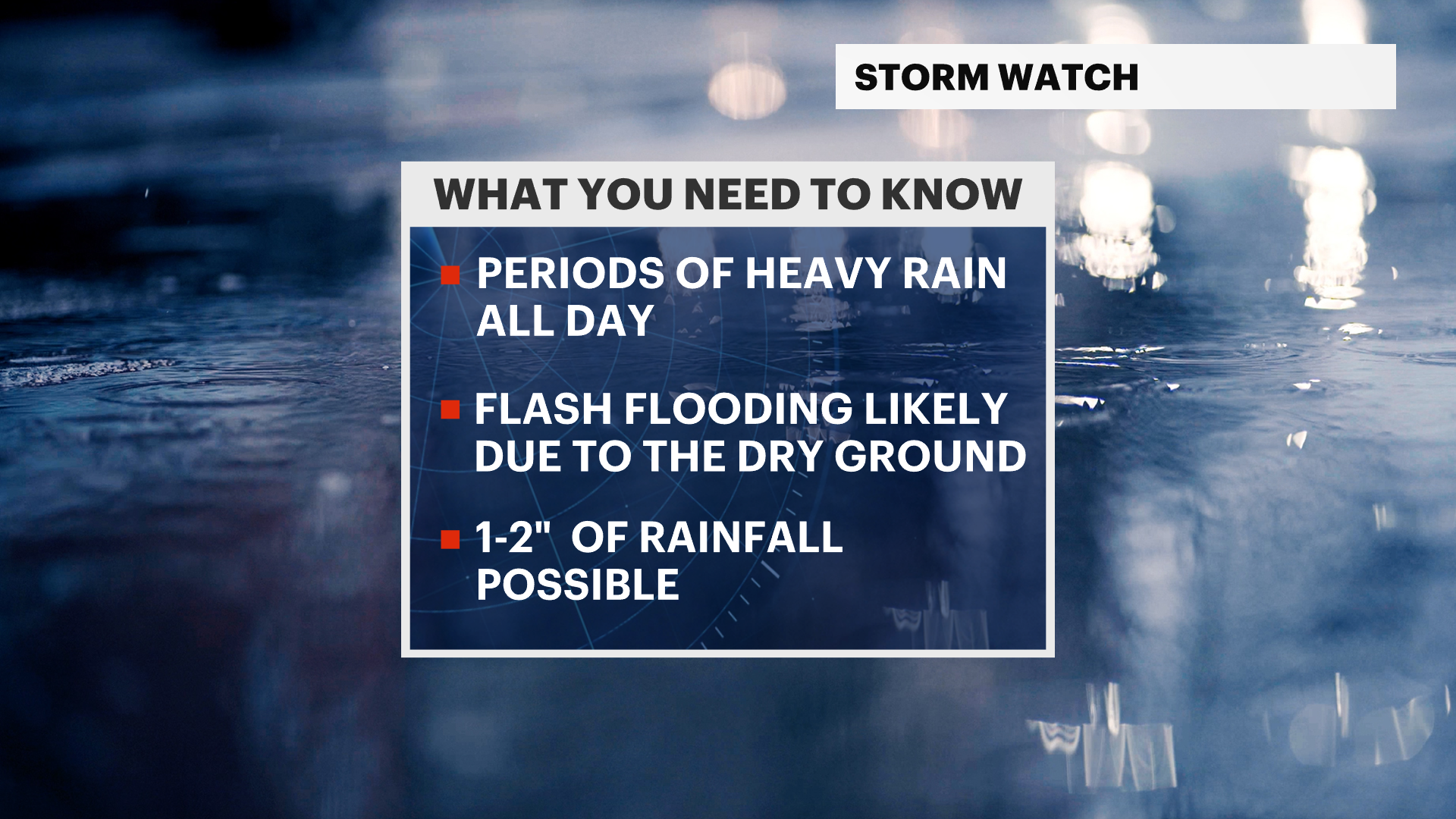 NOW: Scattered showers and storms. Some storms are capable of heavy rain that may lead to flash flooding.