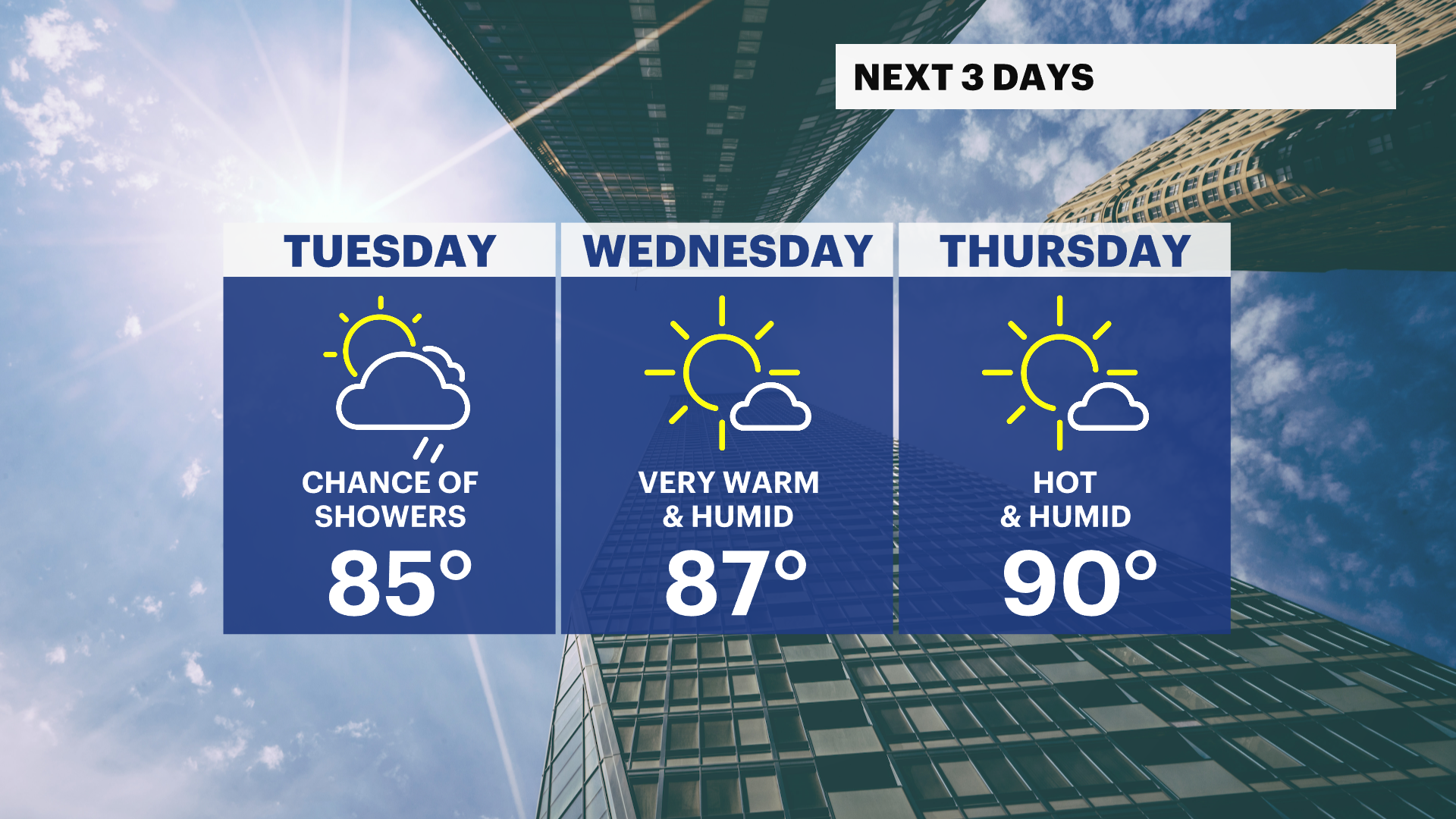 Wednesday: Mostly sunny, hot and humid, highs from the mid- to upper-80s.