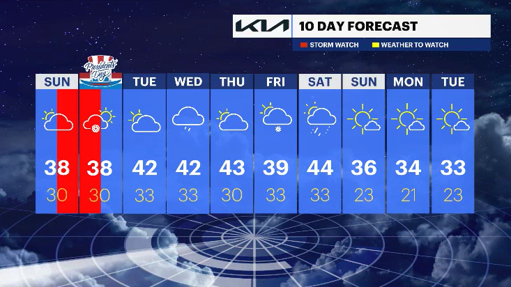 Temperatures are in the 40s for most of the 10-day period, which is the mildest so far this year. However, there are several disturbances to watch, one on Wednesday, which will bring rain, and another from Thursday into Friday and Friday into Saturday. The disturbances later in the week could bring rain or snow, depending on the track, and it is too soon for specifics. The current trend is mainly rain.
